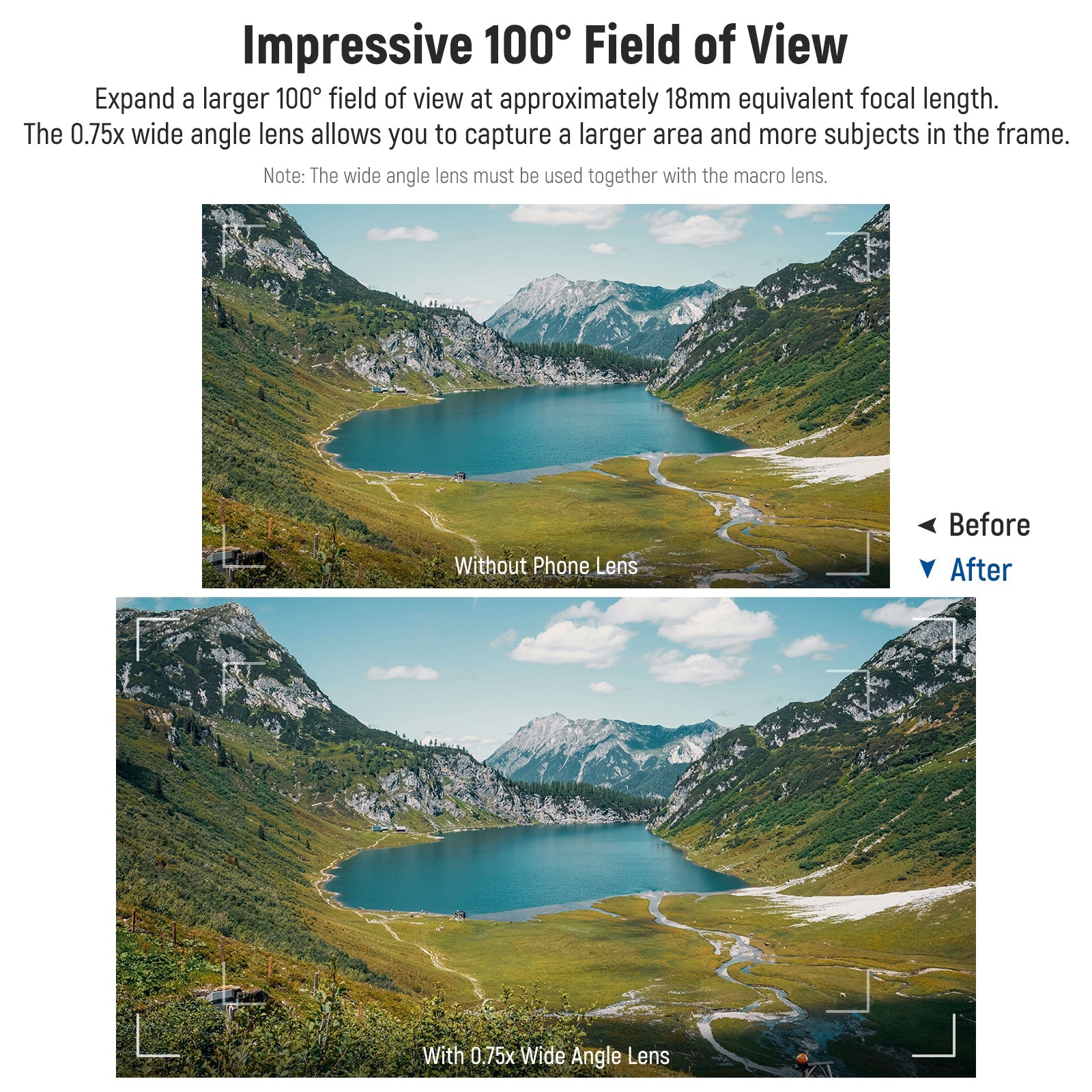- Impressive 100° Field of View- Expand a larger 100° field of view at approximately 18mm equivalent focal length. The 0.75x wide angle lens allows you to capture a larger area and more subjects in the frame, ideal for photography of street, landscape, and architecture and group photos. Note: Use a wide angle lens with a macro lens for best performance