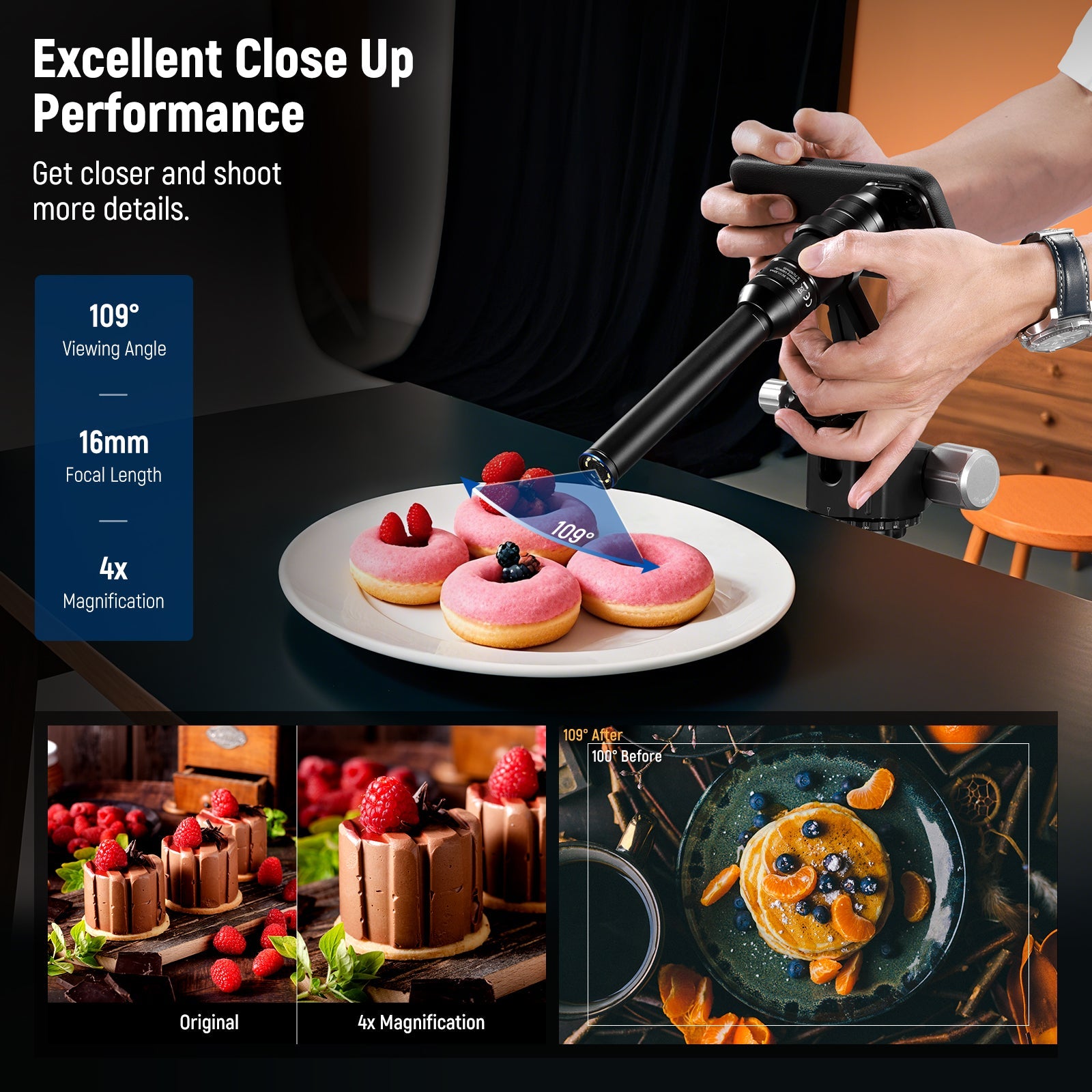 - 4x Magnification & 109° Expanded FOV- With 4x magnification and a 109° expanded field of view, this macro probe lens allows you to capture breathtaking details (such as food, miniatures, and insects) and fit more subjects into the frame. A 340mm slender barrel with 16mm focal distance can get into narrow spaces like animal burrows and pipes while keeping a safe distance