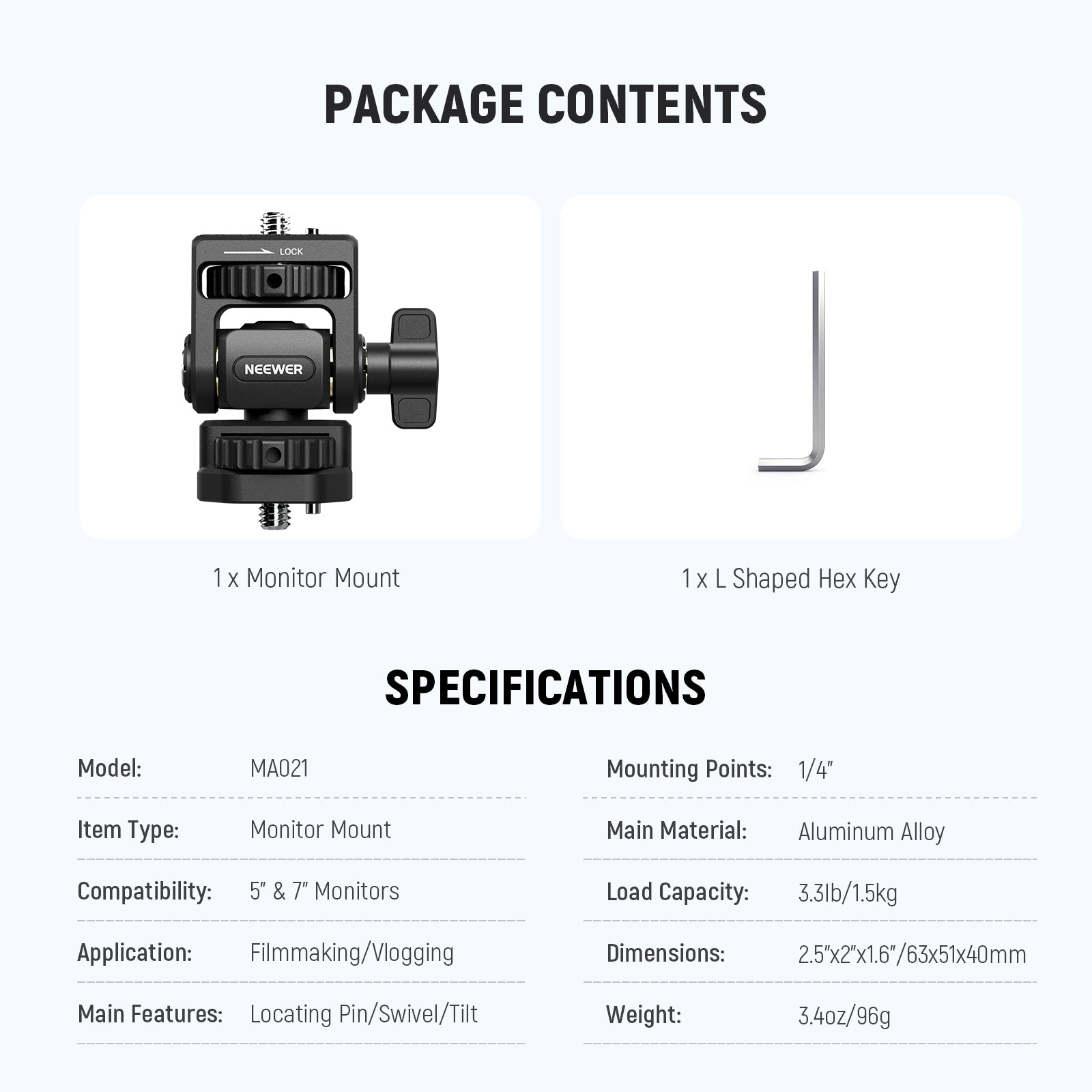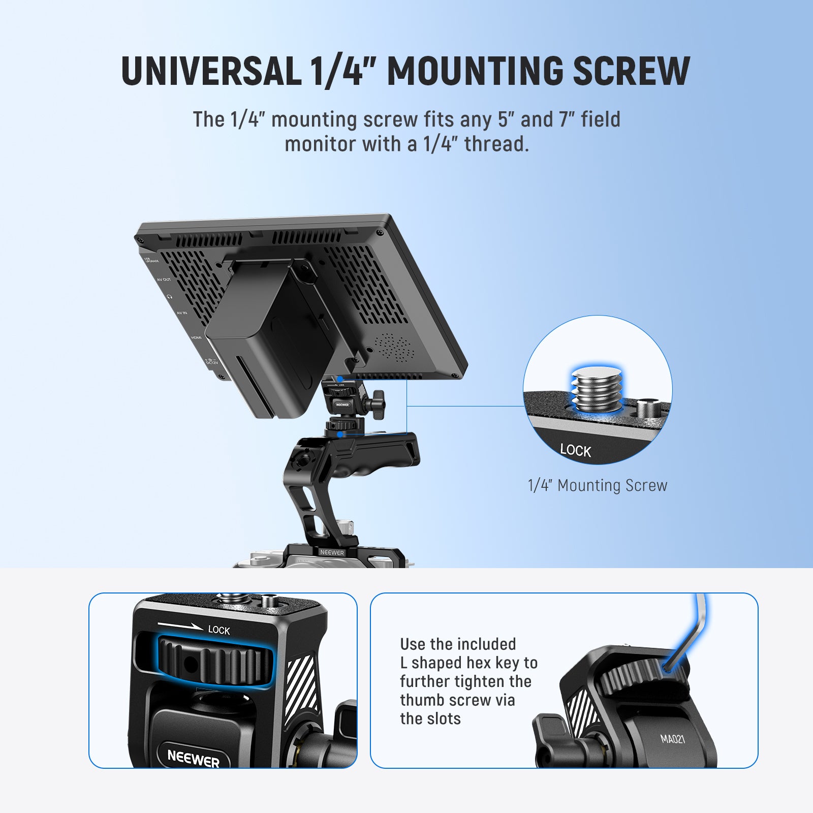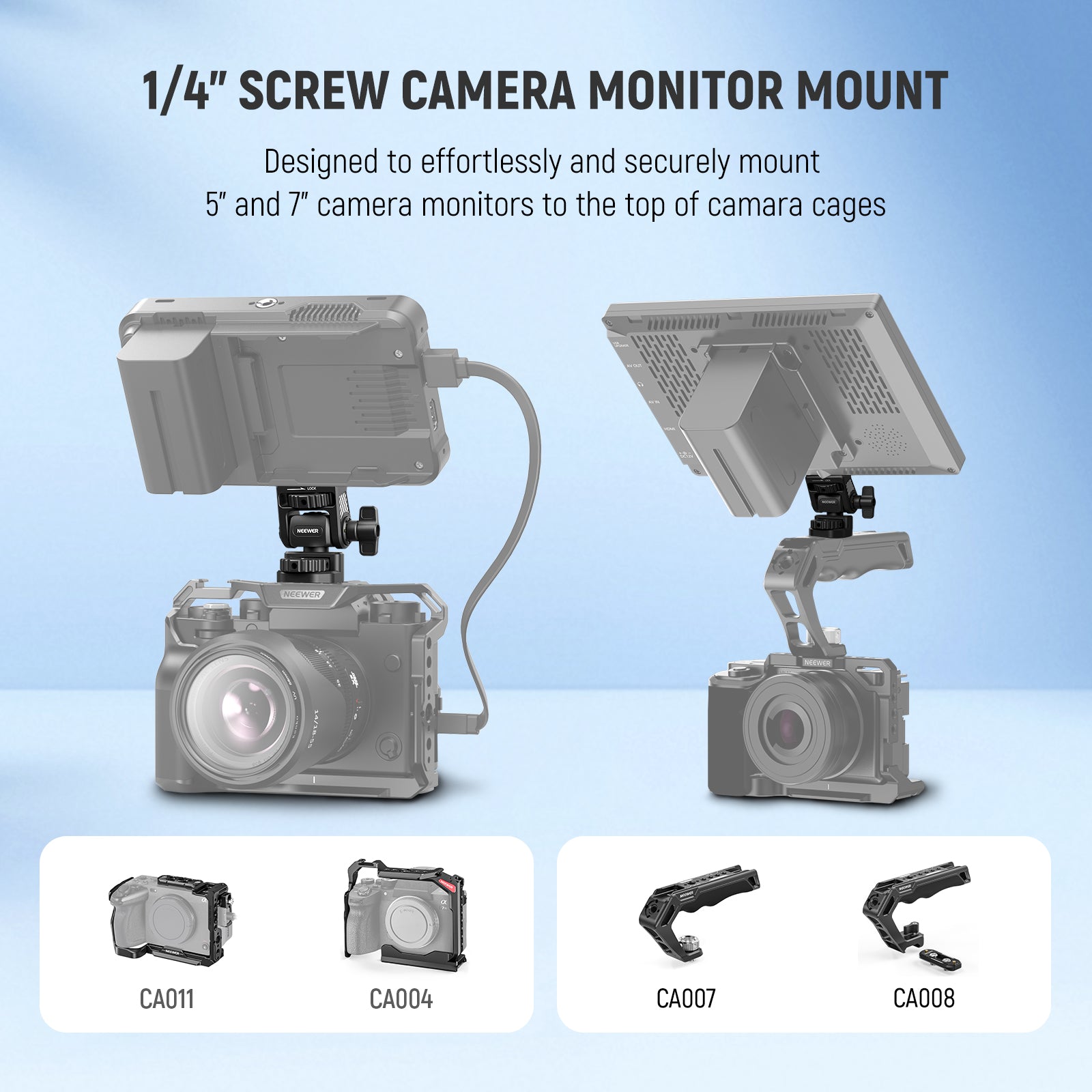 - For 5" & 7" Camera Field Monitors- Designed for 5" and 7" camera field monitors, this monitor mount with a 1/4" screw is compatible with SmallRig and NEEWER camera cages compatible with Canon Sony Nikon Fujifilm Fuji cameras, video rigs, top handle accessories, side handles, gimbal sling handles, and camera hot shoes, perfect for vlogging, filmmaking, and photography