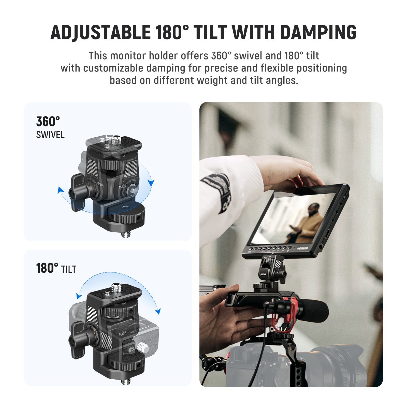 - Adjustable 360° Swivel & 180° Tilt- This field monitor holder offers 360° swivel and 180° tilt with adjustable damping for precise and flexible positioning based on different weight and tilt angles. The side knob enables a quick adjustment simply by hand