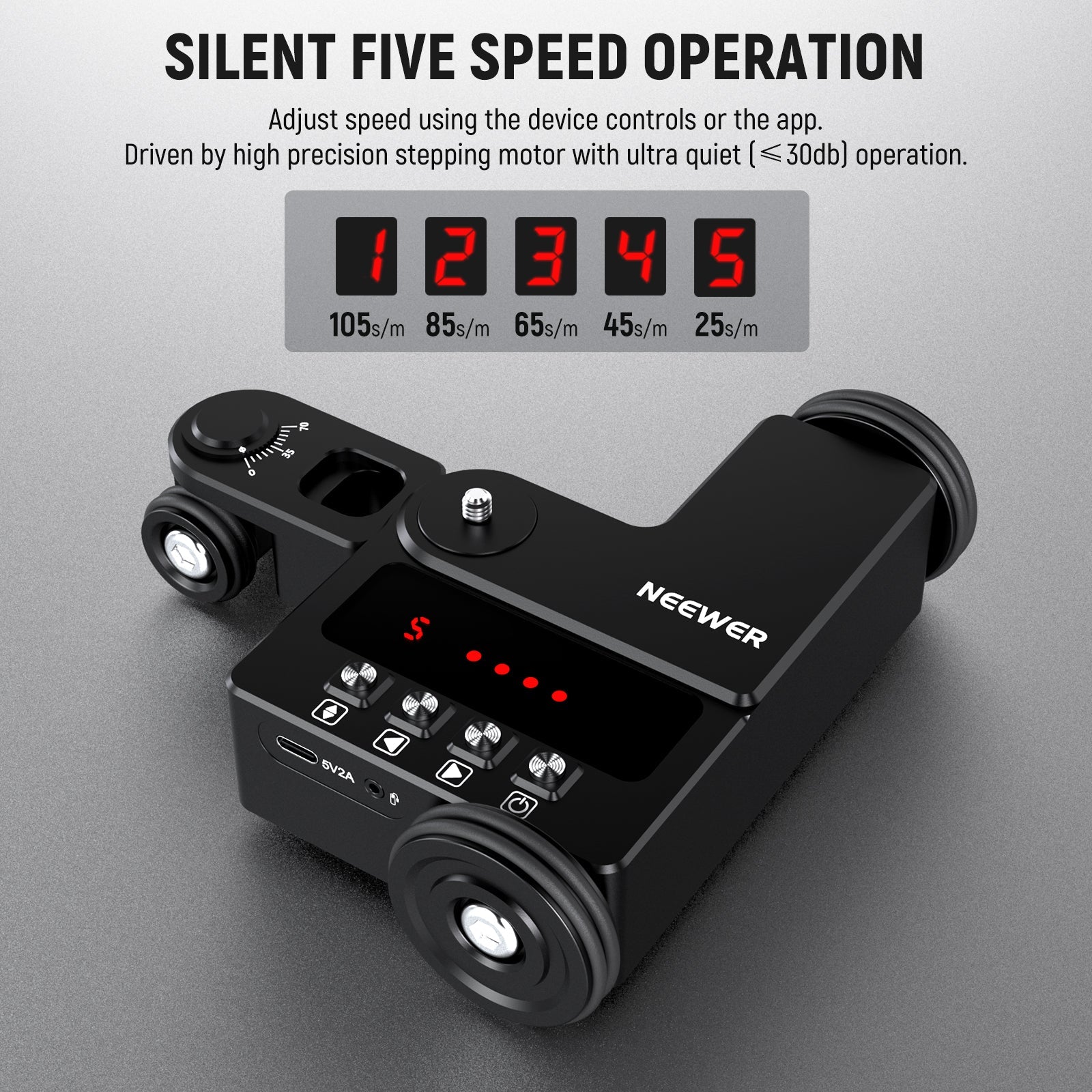 - Smooth & Silent Step Motors- In addition to the precision bearings on the wheels for smoothness, a high precision motor is used to ensure that the sound is kept within 30dB during operation for a quiet video recording environment