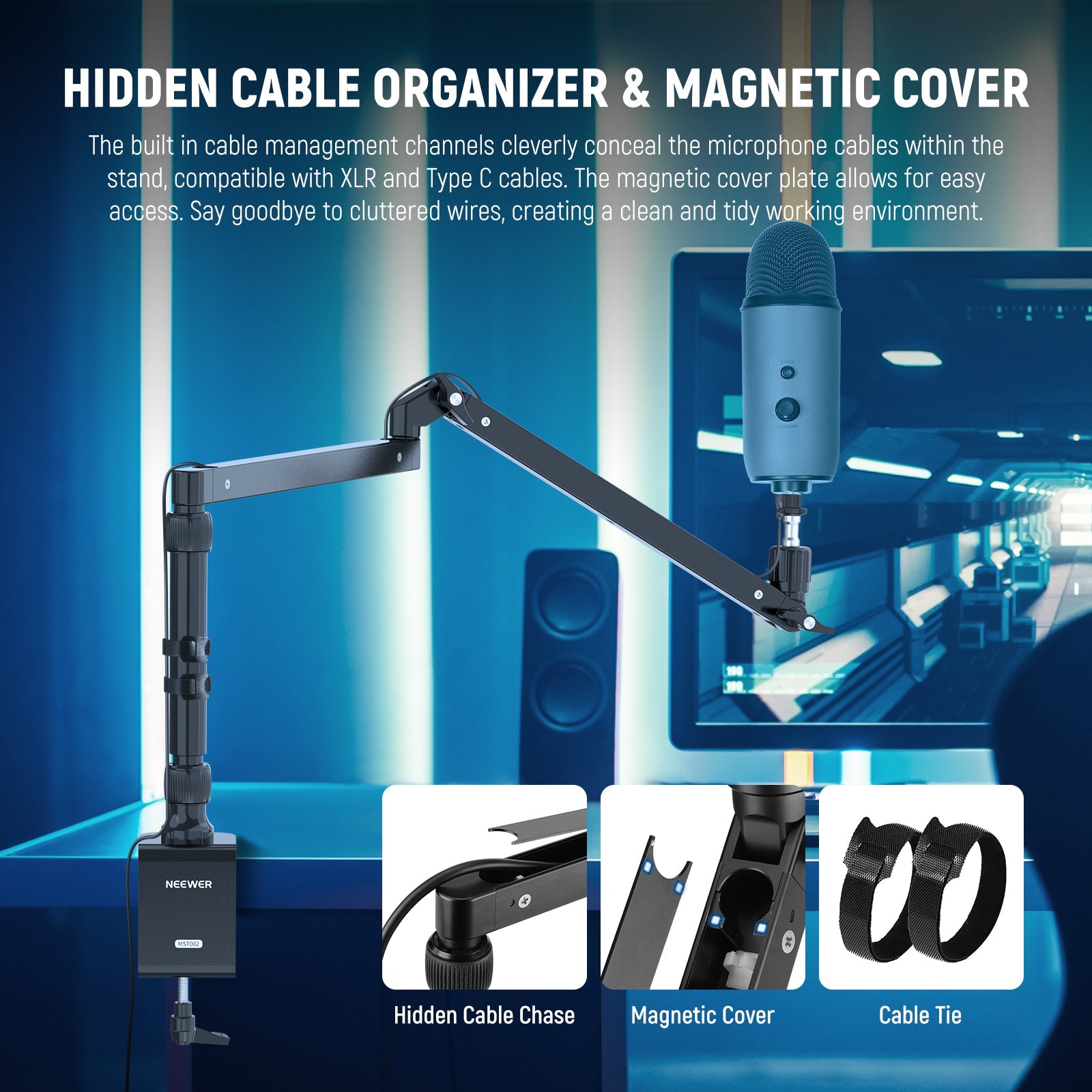• Hidden Cable Organizer & Magnetic Cover- The built in cable management channels cleverly conceal the microphone cables within the stand, compatible with XLR and Type C cables. The magnetic cover plate allows for easy access. Say goodbye to cluttered wires, creating a clean and tidy working environment as content creator essential and influencer must have