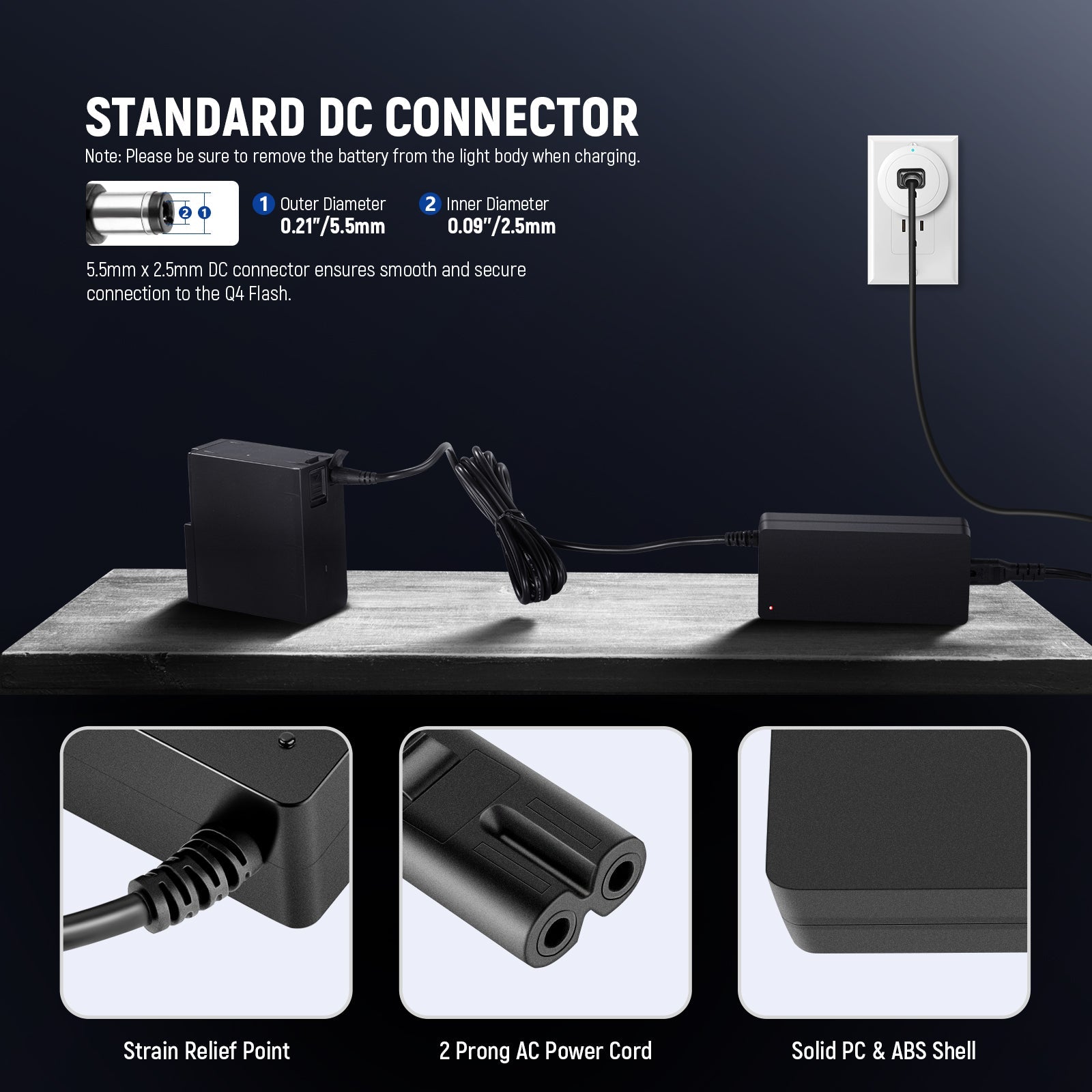 • Standard DC Connector- 5.5mm x 2.5mm DC connector ensures smooth and secure connection to the Q4 Flash