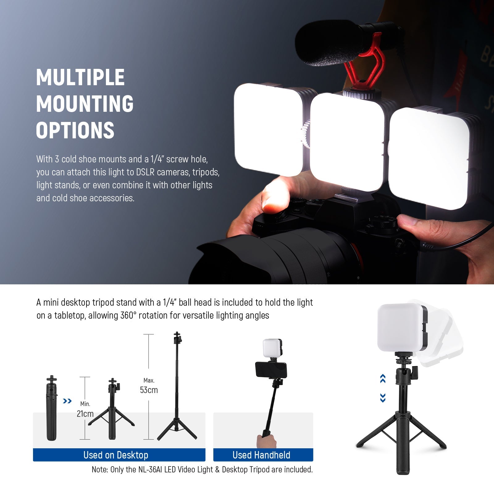 - Adjustable Brightness & Bi Color Temperature- Featuring 10 adjustable brightness levels (10%-100%) and a high CRI of 97+, the NL-36AI LED camera light enhances all skin tones, ensuring you look your best on camera and elevating your content creation quality. The color temperature is adjustable from 3200K (warm white), 4100K (neutral), to 5600K (cool white), providing flexible lighting options for various shooting scenarios
