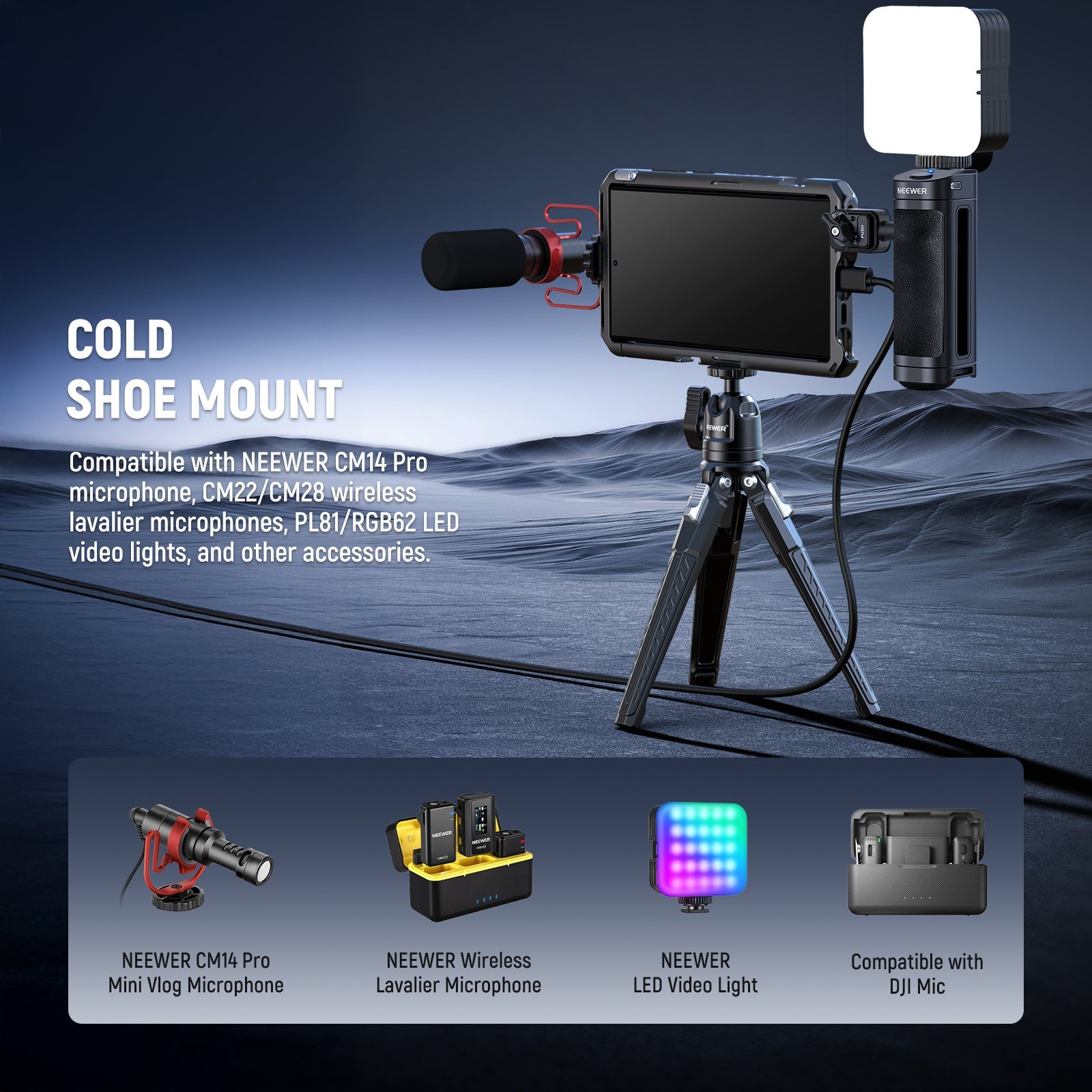 - Cold Shoe Bracket & Wrist Strap Slot- The cold shoe mount is compatible with NEEWER accessories like CM14 Pro Microphone, CM22/CM28 Wireless Lavalier Microphone, and PL81/RGB62 LED Video Light. Tie a wrist strap to the slot to prevent drops during use