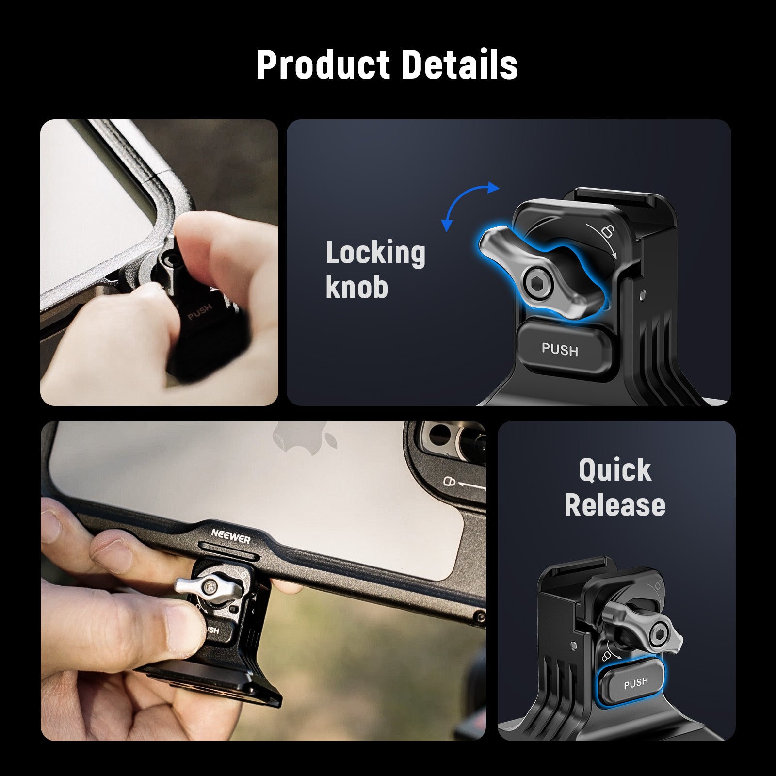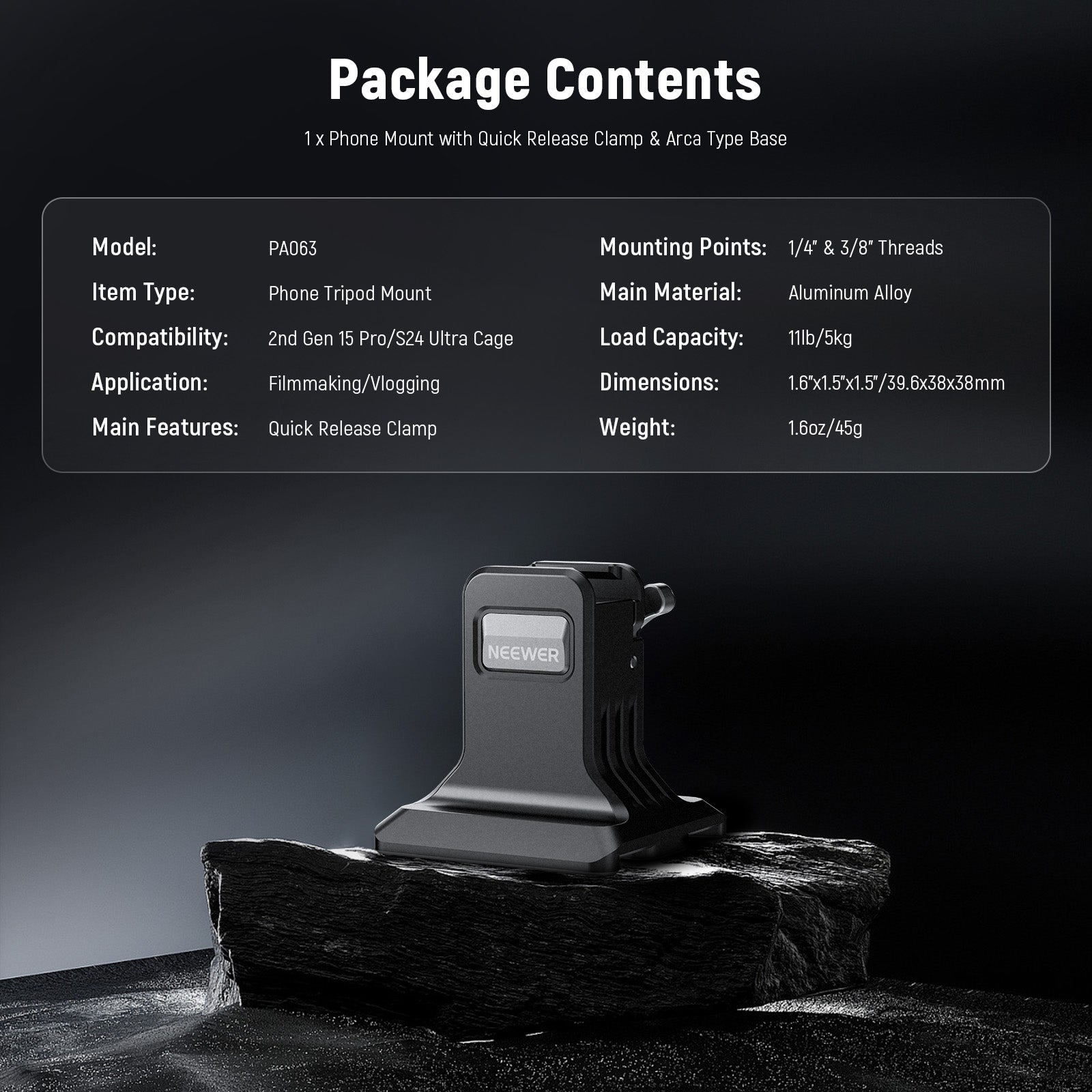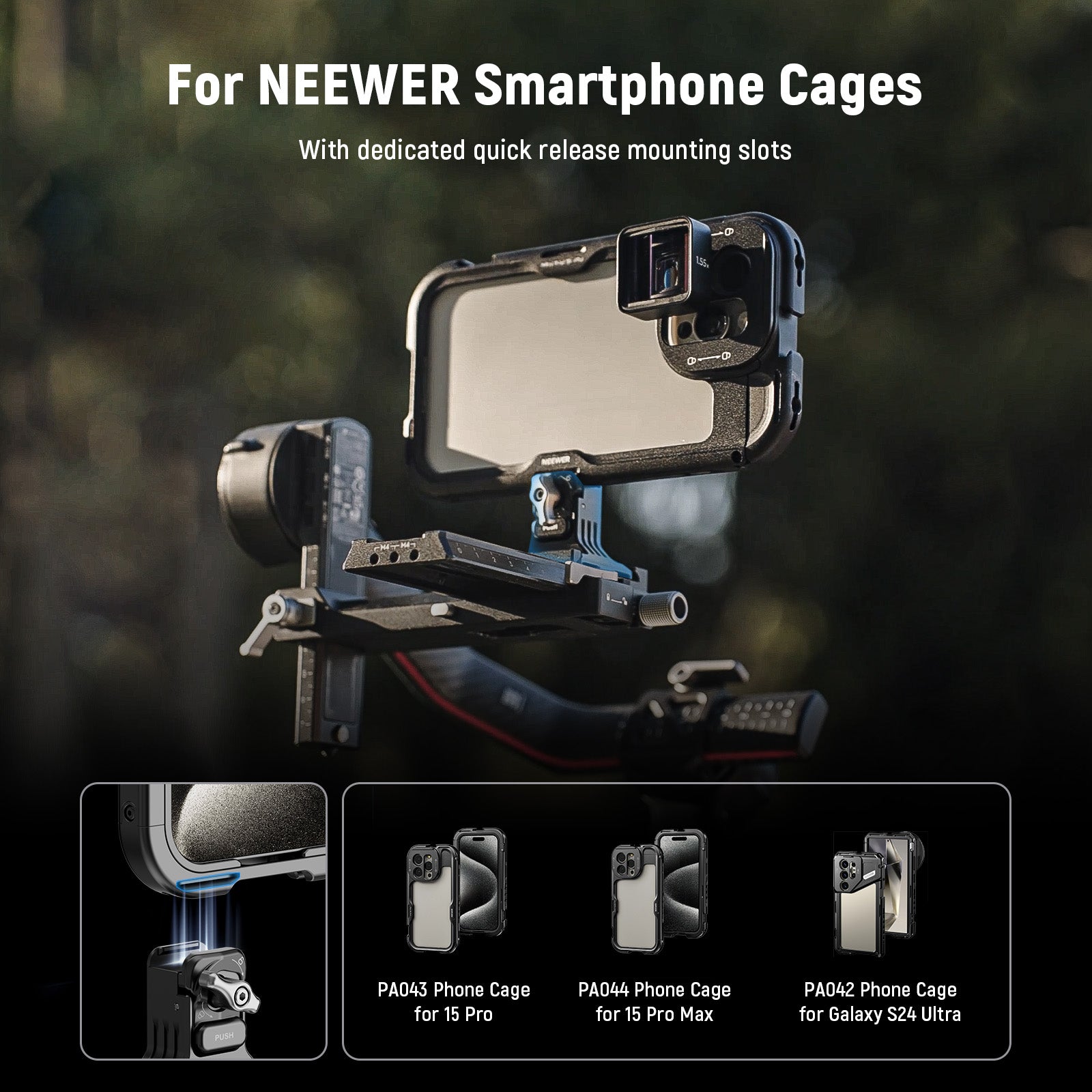 - For 2nd Gen 16 15 Pro/Pro Max & S24 Ultra Cage- This phone tripod mount is exclusively designed for NEEWER smartphone cages accessories with the dedicated quick release mounting slots, such as PA043/PA044 NEEWER 2nd Generation Phone Cage for 16 15 Pro/Pro Max and PA042 Smartphone Video Rig Cage for Galaxy S24 Ultra