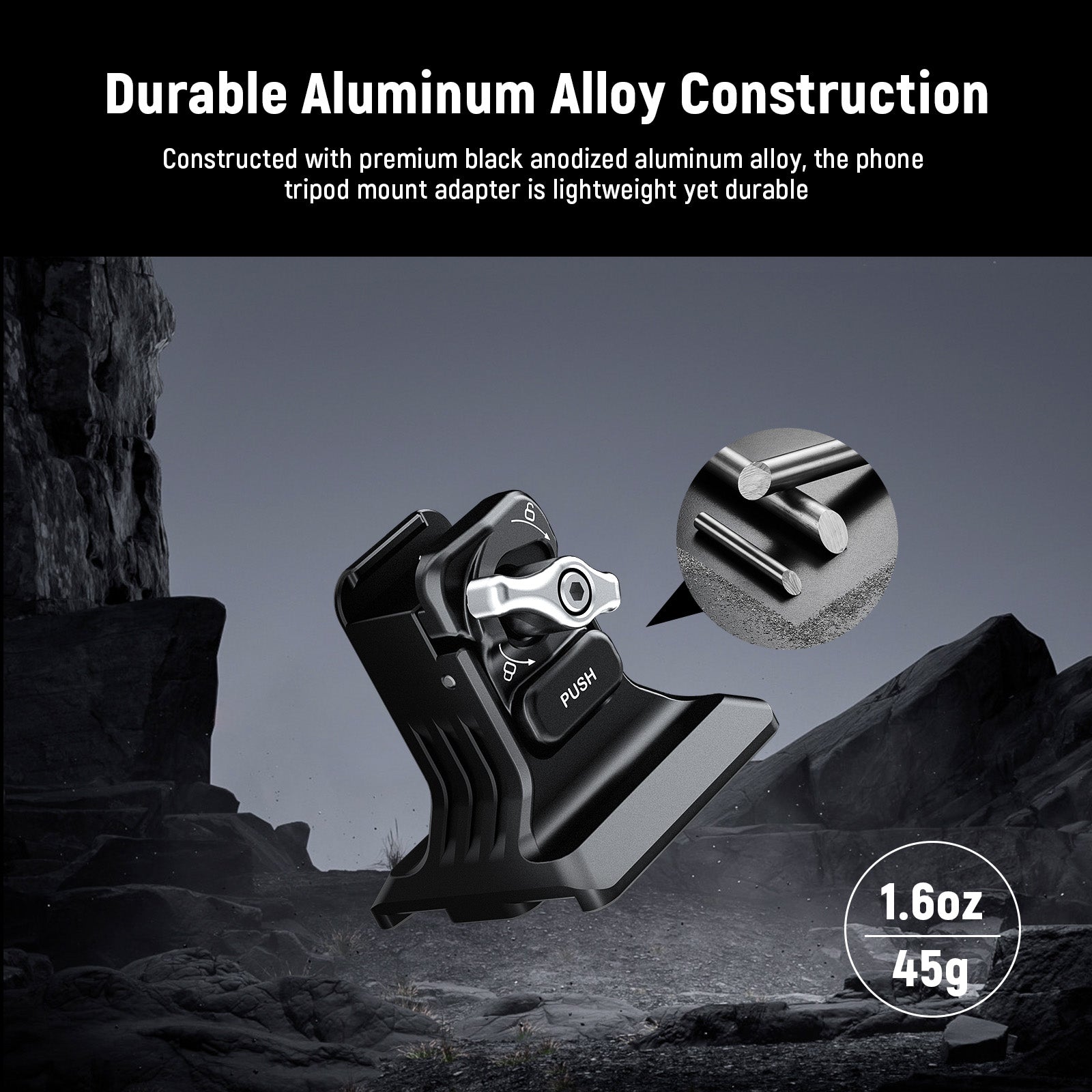 - Durable Aluminum Alloy Construction- Constructed with premium black anodized aluminum alloy, the phone tripod mount adapter is lightweight yet durable, perfect for outdoor vlogging, on location filmmaking, and other creations on the go