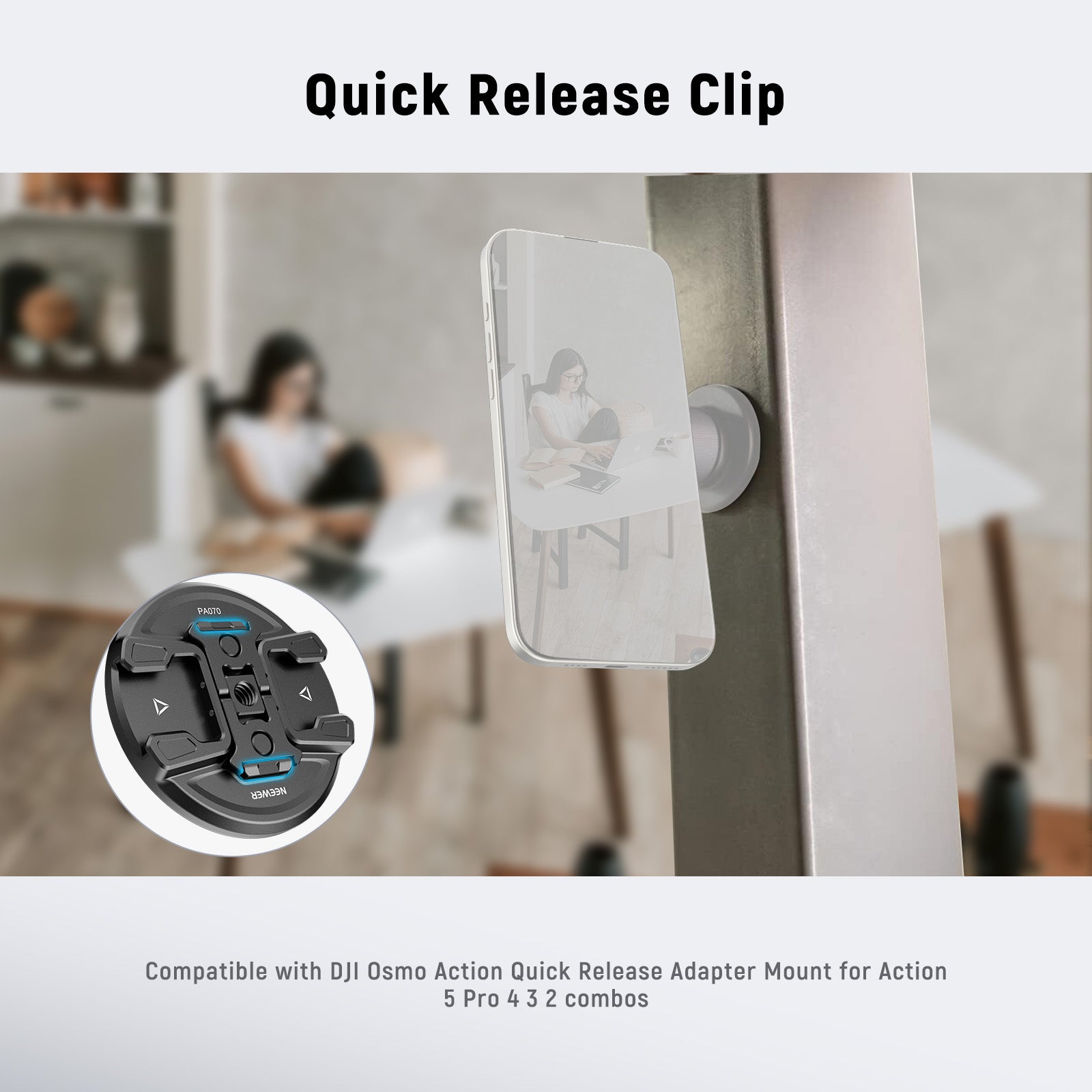 - Foldable Action Camera Mounts- Mount your phone to unlimited action camera accessories for creative mobile shootings, such as chest mounts, neck mounts, bike mounts, and suction cups. The mounts are also compatible with DJI Osmo Action Quick Release Adapter Mount for Action 5 Pro 4 3 2 combos