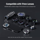 - Backplate for 17mm Lenses- Attaches 17mm phone lenses to the Main Camera and Telephoto Camera like 105mm macro, 10x macro, 8mm fisheye, 45x microscope with LED light, 7x telephoto, 60mm telephoto, 18mm wide angle, 1.55x blue anamorphic (lenses sold separately)