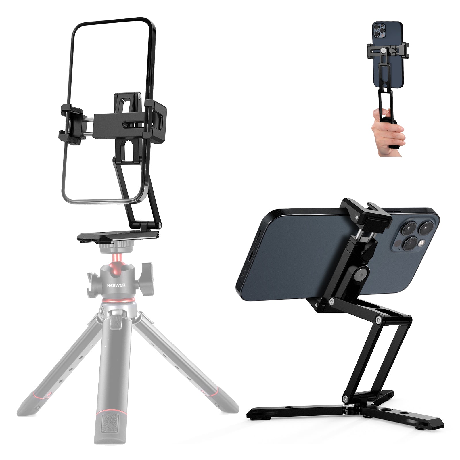 - Diverse Mounting Options- Fold the three split legs into an Arca quick release plate for quick and easy attachment to any tripod head with the identical mounting system, and also come with multiple bottom screw holes (3 x 1/4" and 1 x 3/8") to install on tripods, monopods, gimbals and other systems. The phone clip with two cold shoes to mount LED lights, ring lights, microphones, and more