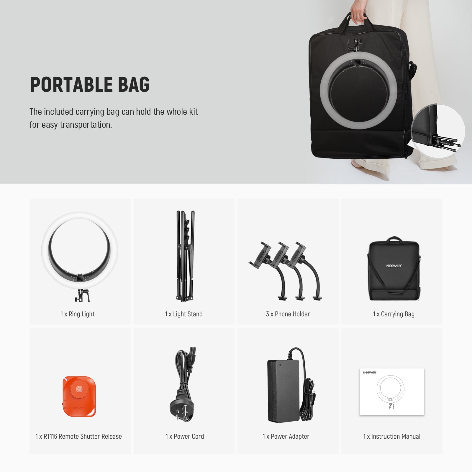 - Reversible & Foldable Light Stand- The supplied light stand with a 2.2-6ft/67-180cm height adjustment range can place your light overhead or at eye level. The stand legs can fold upward and fit inside the carry bag for effortless storage and transportation
