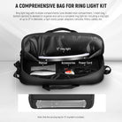 - Compact & Portable Travel Bag- With compact dimensions of 19.7"x16.5"x3.5"/50x42x9cm yet featuring a spacious storage capacity, this carrying case keeps your ring light and accessories well organized and mess free. The dual handles and one shoulder strap offer multiple carrying options, making it easy to transport for outdoor uses