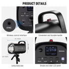 - Efficient & Silent Heat Dissipation- The newly upgraded heat dissipation system adopts a silent cooling fan and superior radiators to effectively decrease operating temperature, prolong the lifespan of the monolight, create a quiet shooting environment, and prevent overheating after 260 continuous full power flashes