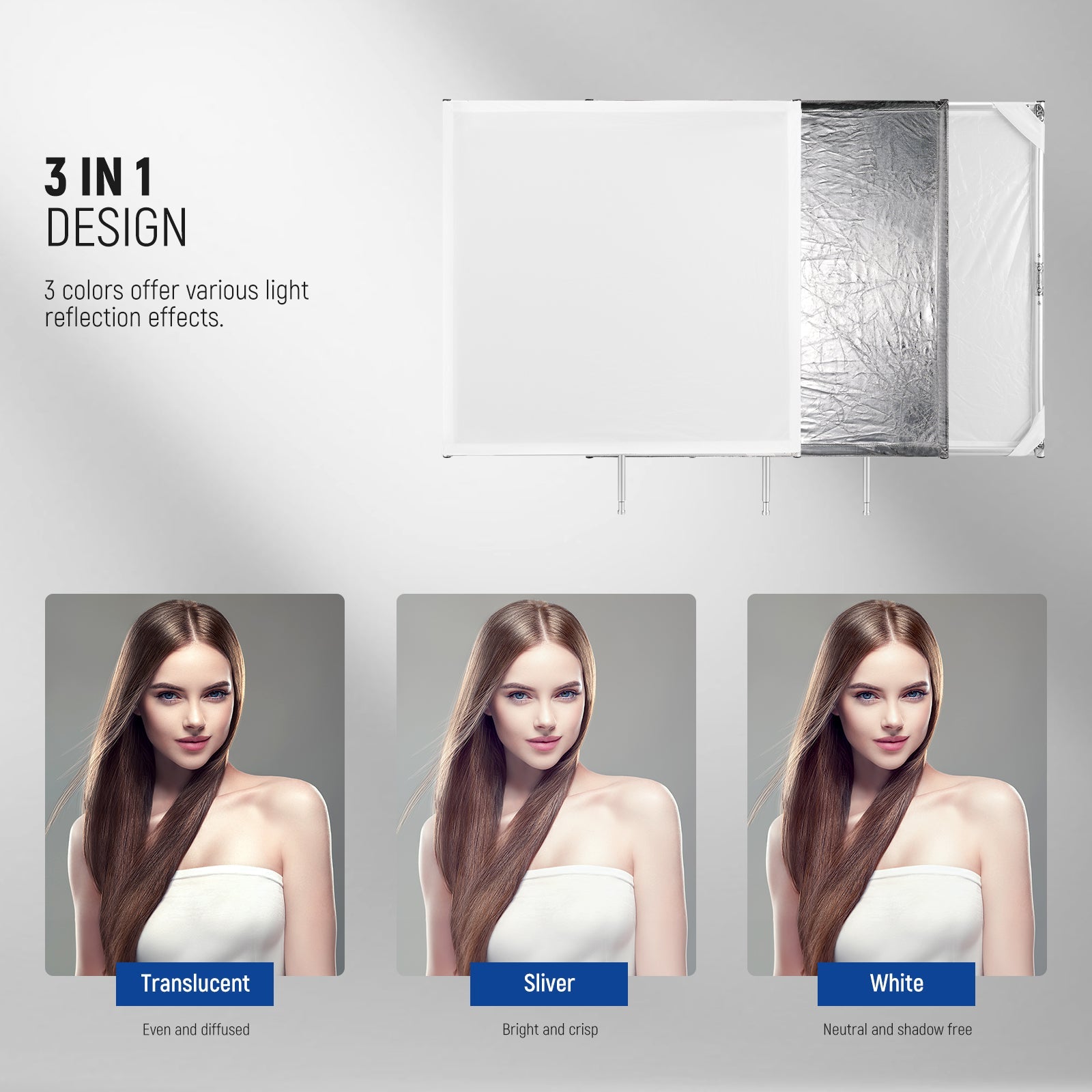 - Extensive Application- A versatile 3 in 1 sun scrim light diffusion set that not only softens the sunlight and artificial light sources, but also features additional silver/white reflector covers for product photography, portraits, commercial shooting, weddings, fashion, and other outdoor or studio creation