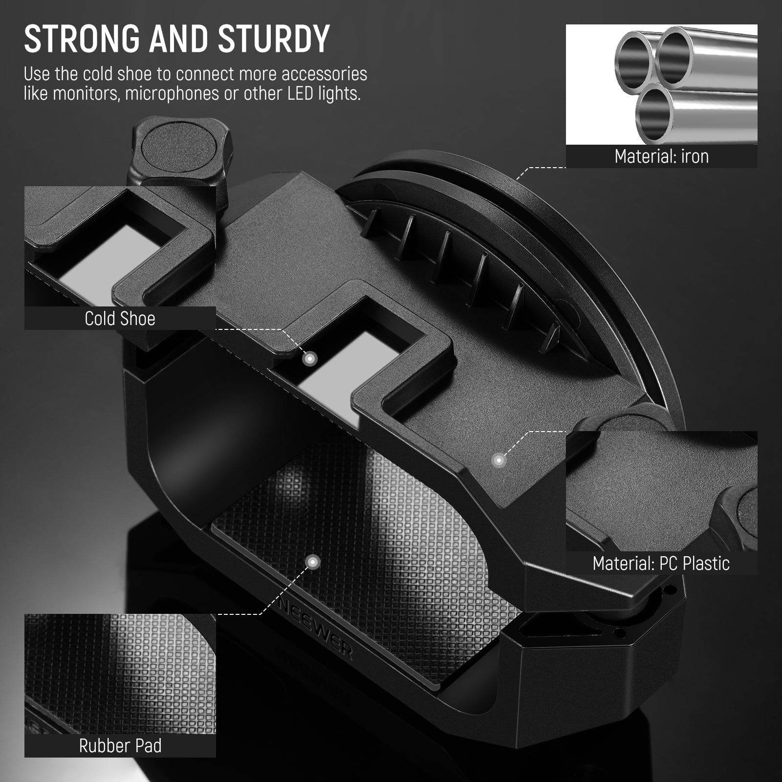- Built-in Cold Shoe- Enhance your setup with a built in cold shoe mount that can attach more accessories like monitors, microphones or other LED lights for a versatile and streamlined photography experience