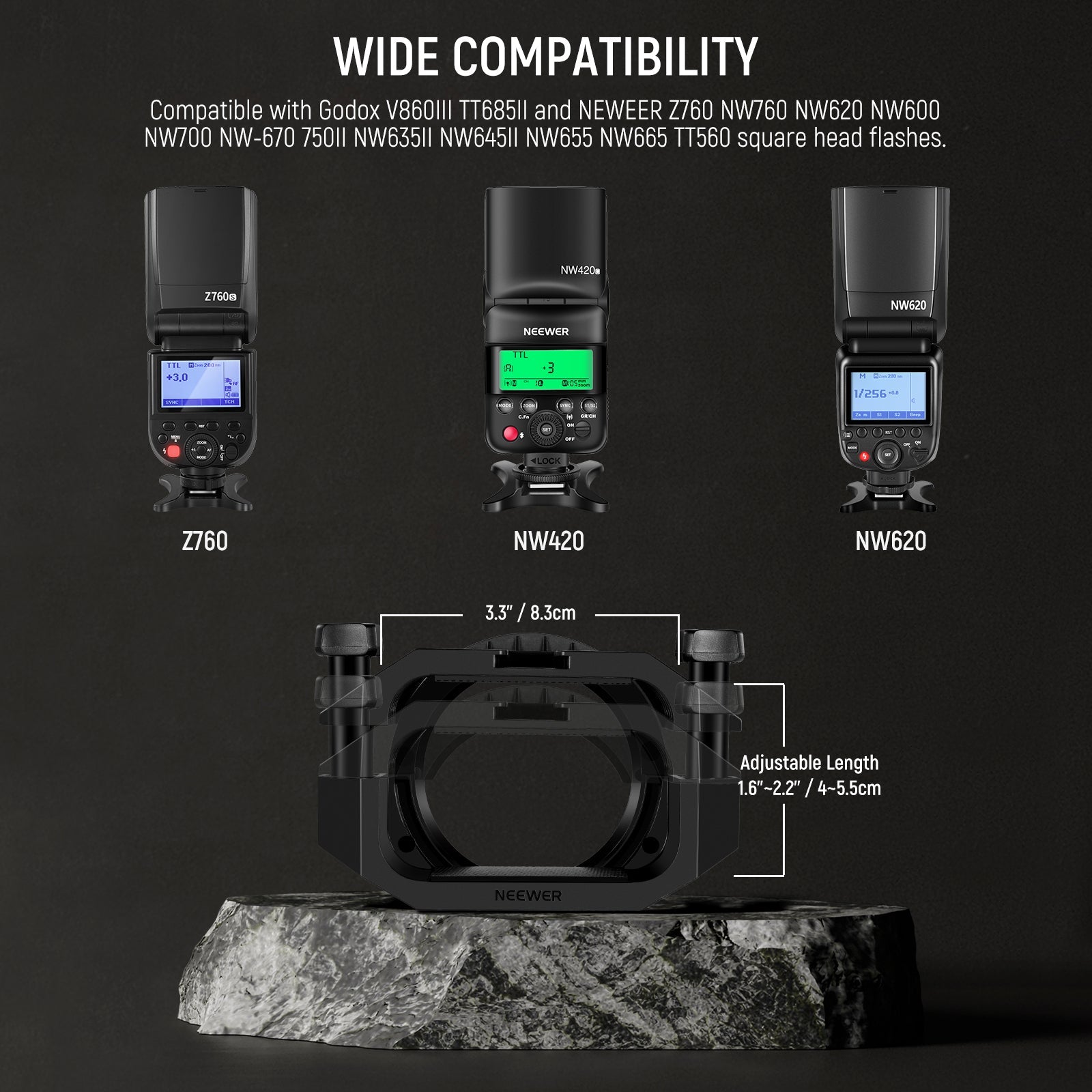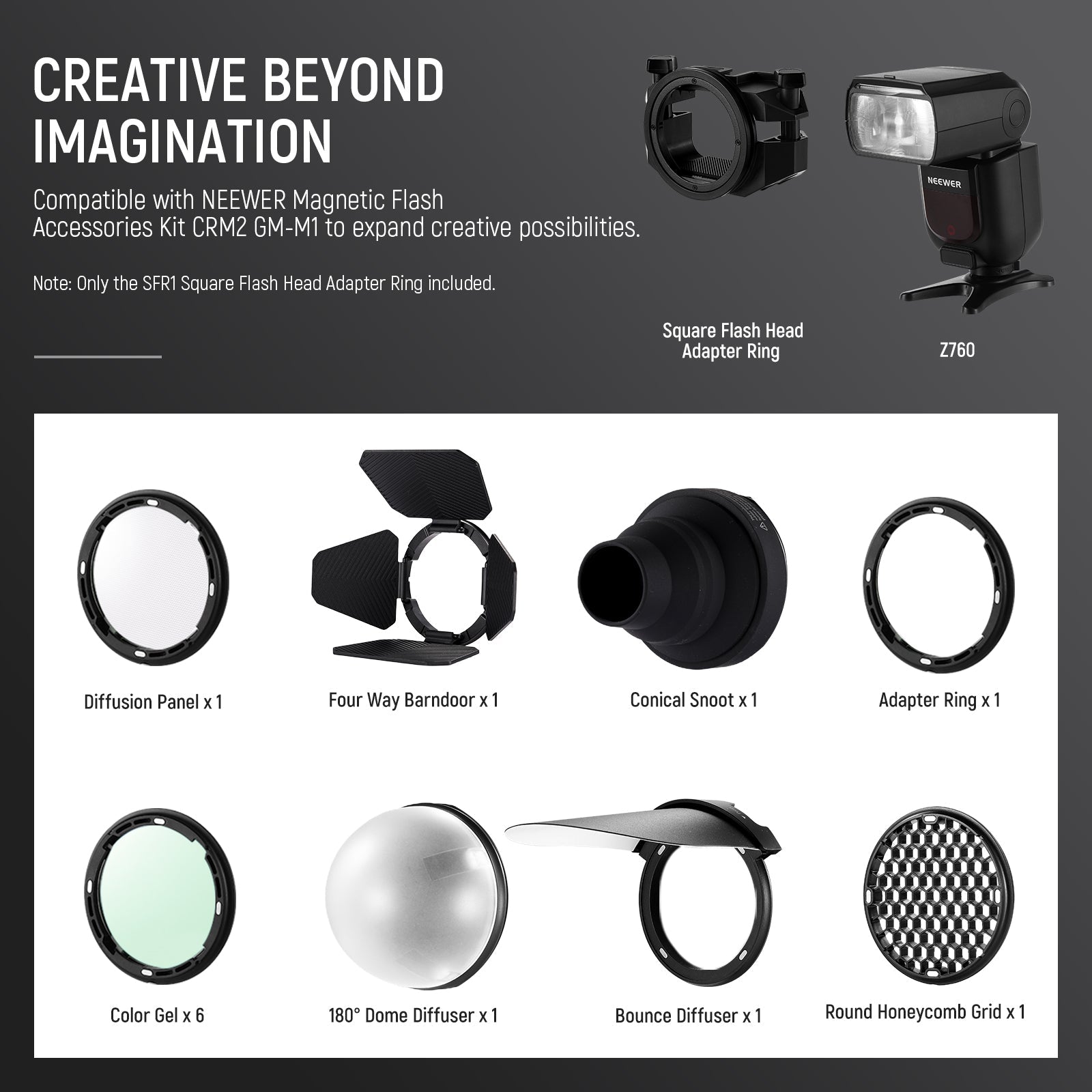 - Square Flash Head Adapter Ring- Help mount your square head speedlight flash onto our CRS6 diffusion dome and other more round head flash lighting control accessories with this adapter ring, fits NEWEER Z760 NW760 NW620 NW600 NW700 NW-670 750II NW635II NW645II NW655 NW665 TT560 square head flashes, NEEWER magnetic flash accessories kit CRM2, GM-M1 to expand creative possibilities, also compatible with Godox V860III TT685II square flash AK-R1 accessories kit