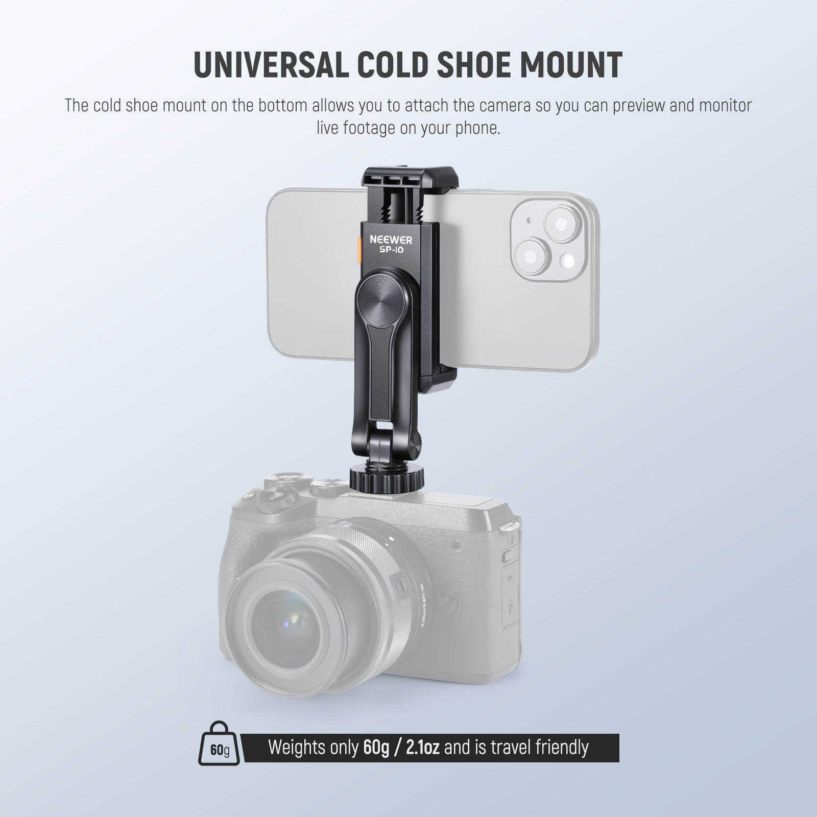 - Universal Cold Shoe Mount- The bottom of a cold shoe mount allows you to attach a camera, so you can preview and monitor real time shooting footage on your phone with this camera phone mount. Or you can attach an LED fill light, video light, microphone, or other equipment to improve your video quality