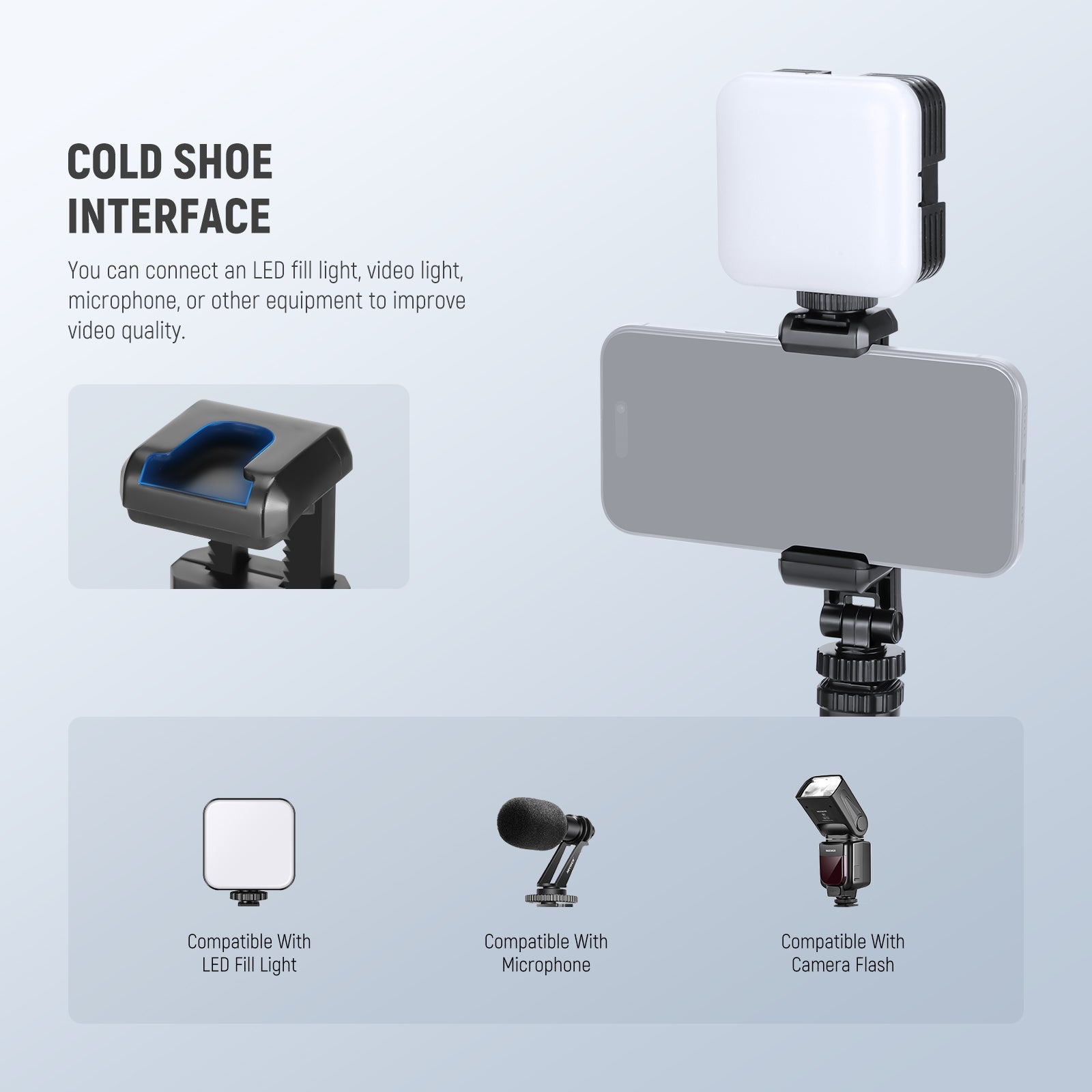 Stable & Secure Phone Clamp- Our cold shoe phone mount features a silicone pad inside the clamp to enhance slip resistance and protect your phone from scratches. It firmly holds your phone on your tripod, freeing your hands and allowing you to focus on your live stream, selfie, or photography