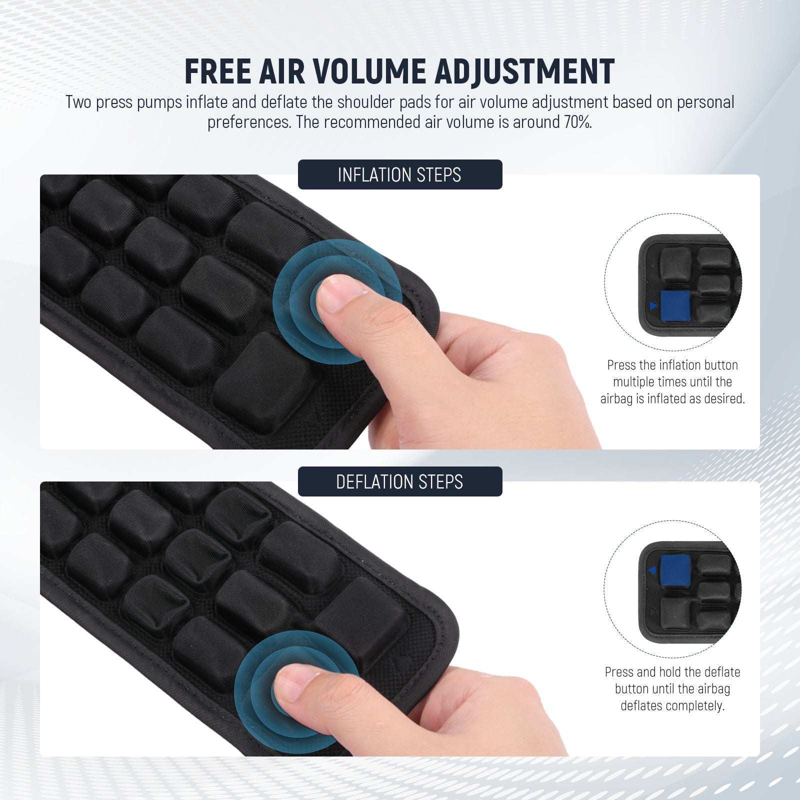 - Free Air Volume Adjustment- Two press pumps to inflate and deflate the shoulder pads for air volume adjustment based on personal preferences. The recommended air volume is around 70%