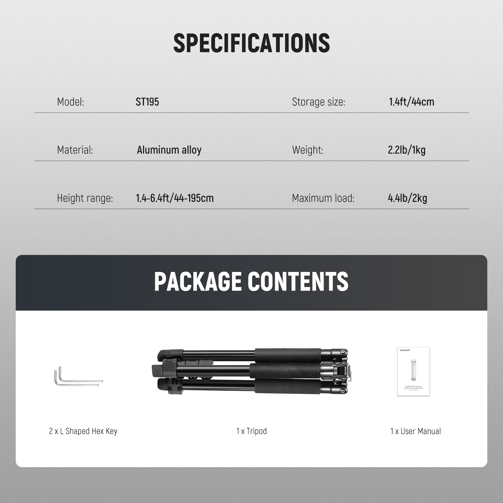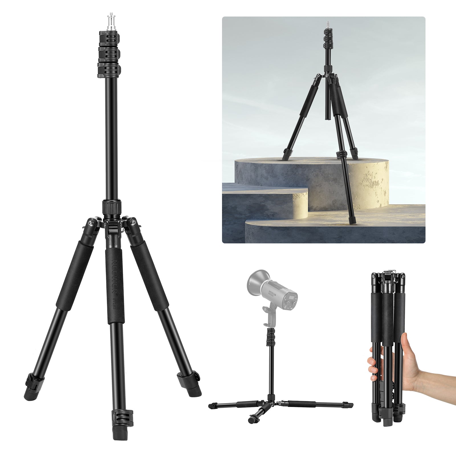 - Versatile Compatibility- NEEWER ST195 photography tripod stand has a 1/4" screw to attach a wide range of photography devices more than just strobe lights, such as continuous output lighting, ring lights, LED video lights, monolights, softboxes, umbrellas, and action cameras. Whether it's product shooting, portrait photography, or outdoor captures, this tripod stand has you covered