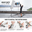 - Adjustable Height- This rolling stand is easy to adjust within the height range of 3.7ft to 7.9ft (113cm to 240cm) , providing a handy and reliable solution to meet different lighting height requirements for an enhanced photography experience. It can be used for a low mounting position even with a high load capacity. The central shaft rod can be lowered to the ground by a twist knob, transforming the three legged base into a four legged one for added stability