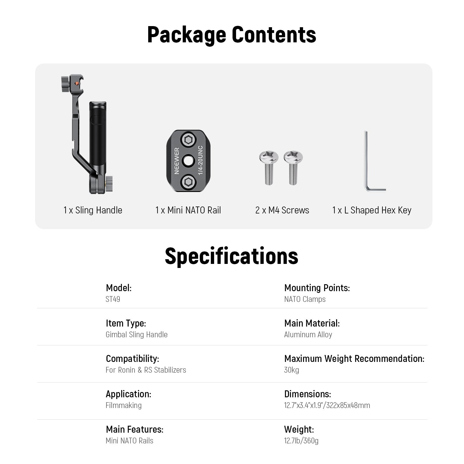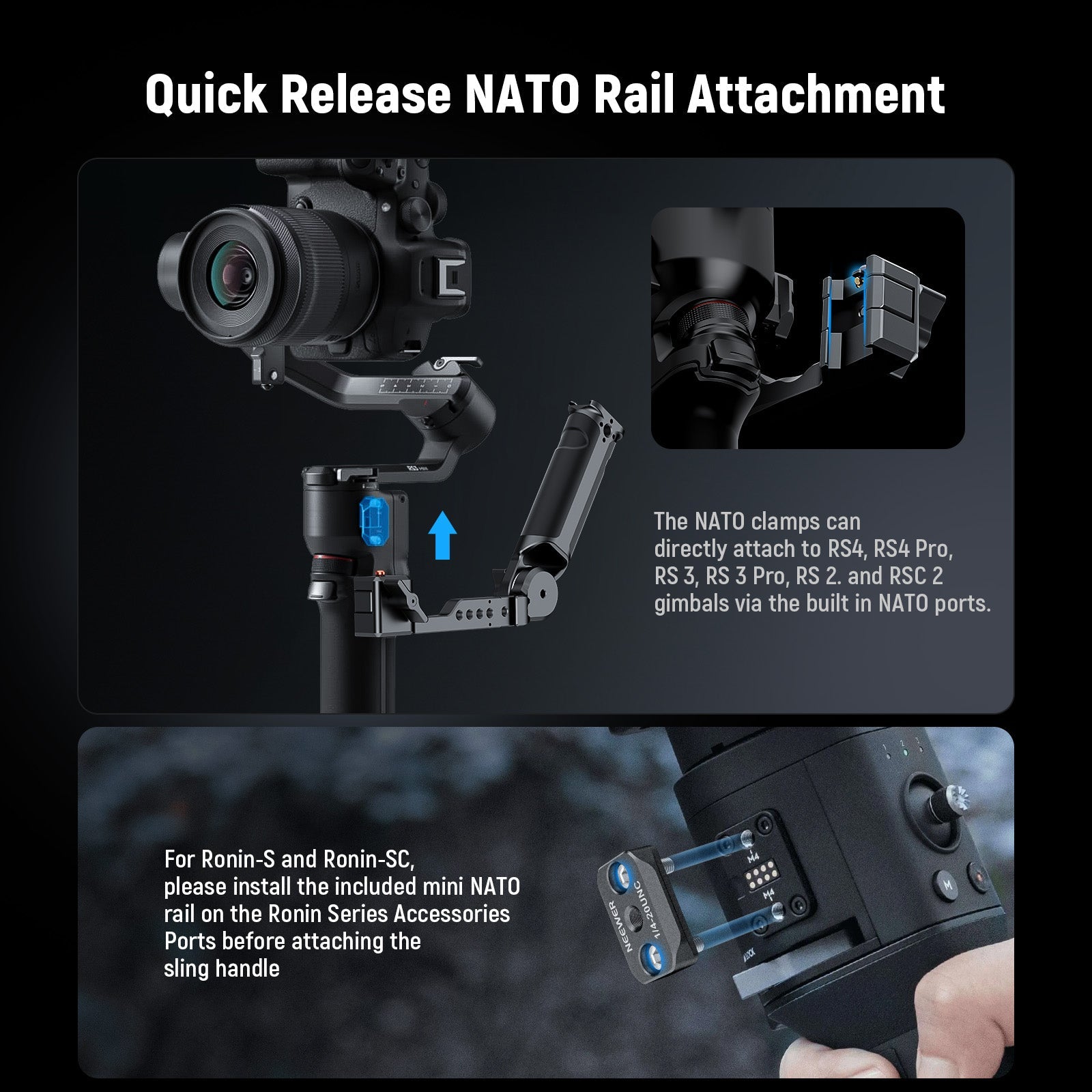 - Quick Release NATO Rail Attachment- The NATO clamp can directly attach to RS4, RS4 Pro, RS3, RS3 Pro, RS2, and RSC2 via built in NATO ports. For Ronin-S and Ronin-SC, please install the included mini NATO rail on the Ronin Series Accessories Ports, then attach the sling handle