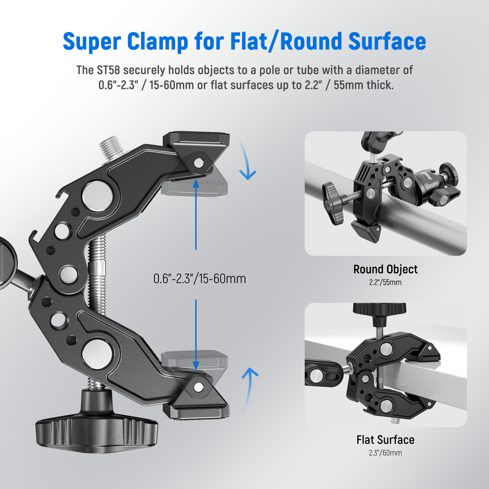 - Super Clamp for Flat/Round Surface- The ST85 securely holds objects to the pole or tube with a diameter from 0.6"-2.3"/15-60mm or flat surfaces up to 2.2"/55mm thick, ideal for tripod legs, selfie sticks, light stands, shoulder rigs, handlebar mount for bicycle. Compatible with DJI Ronin-M Ronin MX Freefly Movi 25mm/30mm gimbal stabilizer rods. Rubber padding for stability and scratch prevention. The durable black anodized aluminum alloy build ensures a 3.3lb/1.5kg load capacity