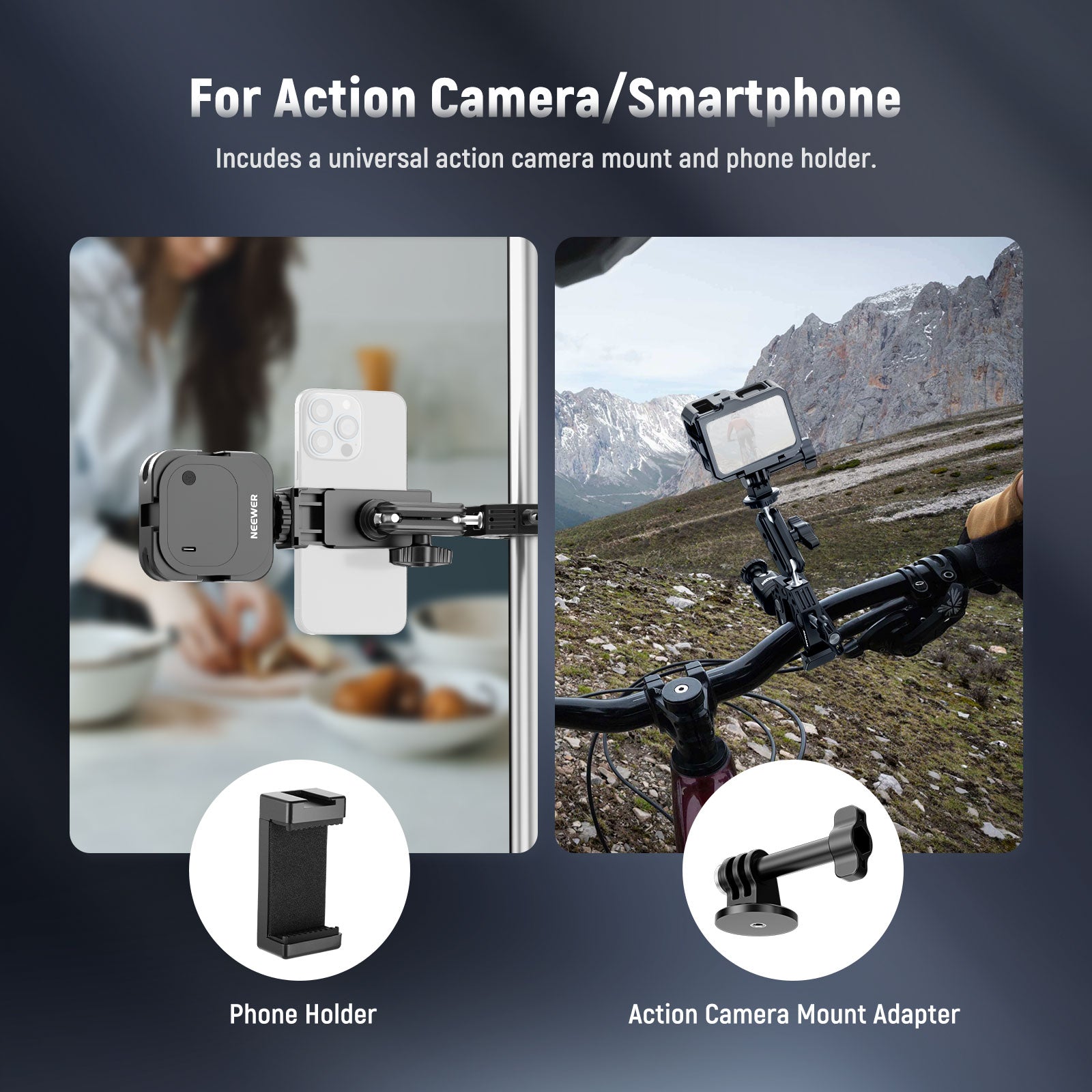 - For Action Camera/Smartphone- The package comes with a universal action camera mount adapter which is compatible with GoPro Hero 12 11 11 mini 10 9 Max Insta360 ONE X3 X2 GO 3 GO 2 DJI Osmo Action 4 3 2, etc. A 2"-3.3" (5-8.5cm) adjustable phone clamp is compatible with iPhone 15 Pro Max 14 13 Pro Max 14 Plus 13 Mini 12 X Xs Max Samsung Galaxy S23 A22 Ultra Huawei P60 Pro Mate 60 Google Pixel 7 Pro and other smartphone brands on the market