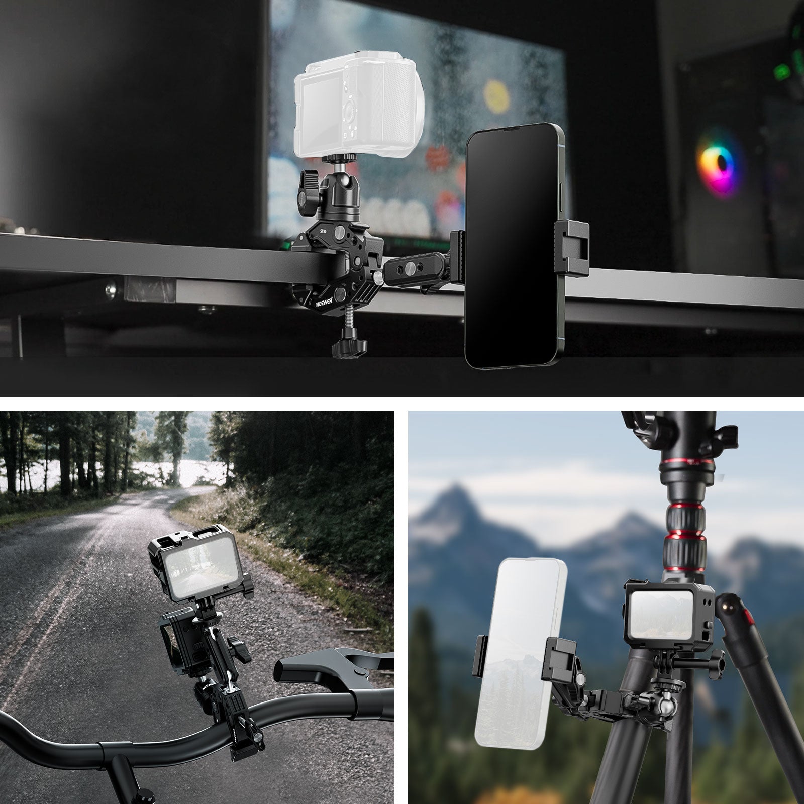 - 3" Flexible Articulated Magic Arm- Dual ball heads enable free 360° rotation for flexible device angle positioning. The universal 1/4" screws can mount NEEWER RGB61, NL-60AI, NL36AI LED Video Lights, F400/F500 Field Monitors, and other devices. It is detachable so that you can mount it separately on a camera cage, top side handle, or a side 1/4" screw hold on the tripod head, compatible with SmallRig camera cages handles