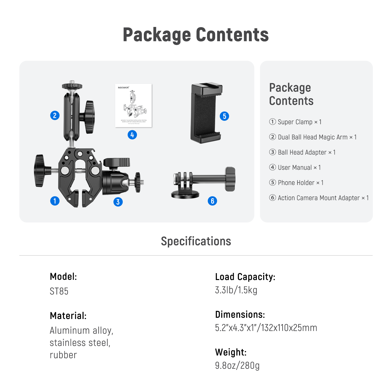 NEEWER ST85 Super Clamp with 3" Dual Ballhead Magic Arm