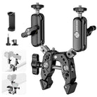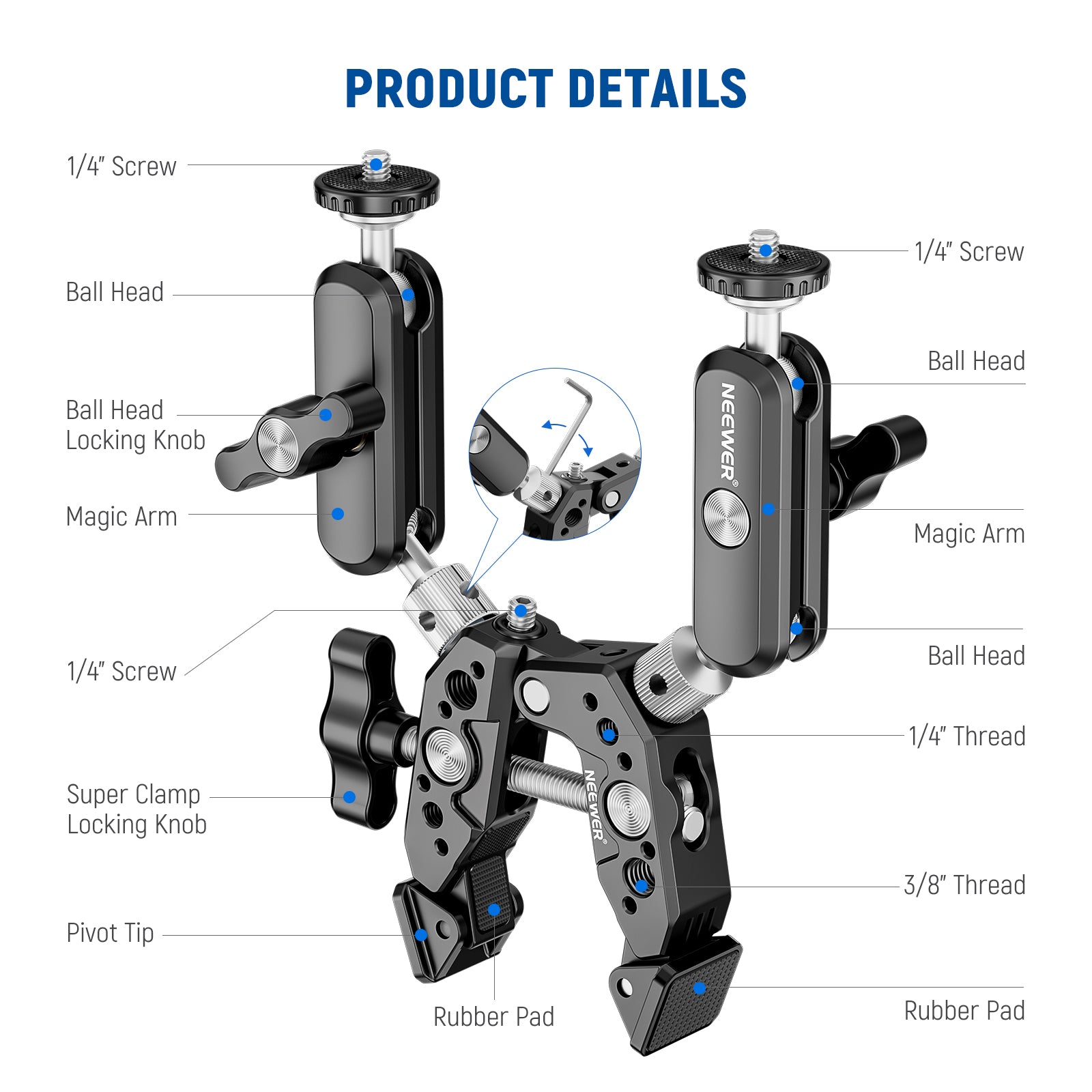 - Two Magic Arms with Dual Ball Heads- Double magic arms of this camera clamp mount allow you to mount two devices at the same time. The adjustable ball head structure enables 360° rotation for free device positioning, and 1/4" mounting screws suit various devices. Use locking knobs to adjust and secure magic arms with ease