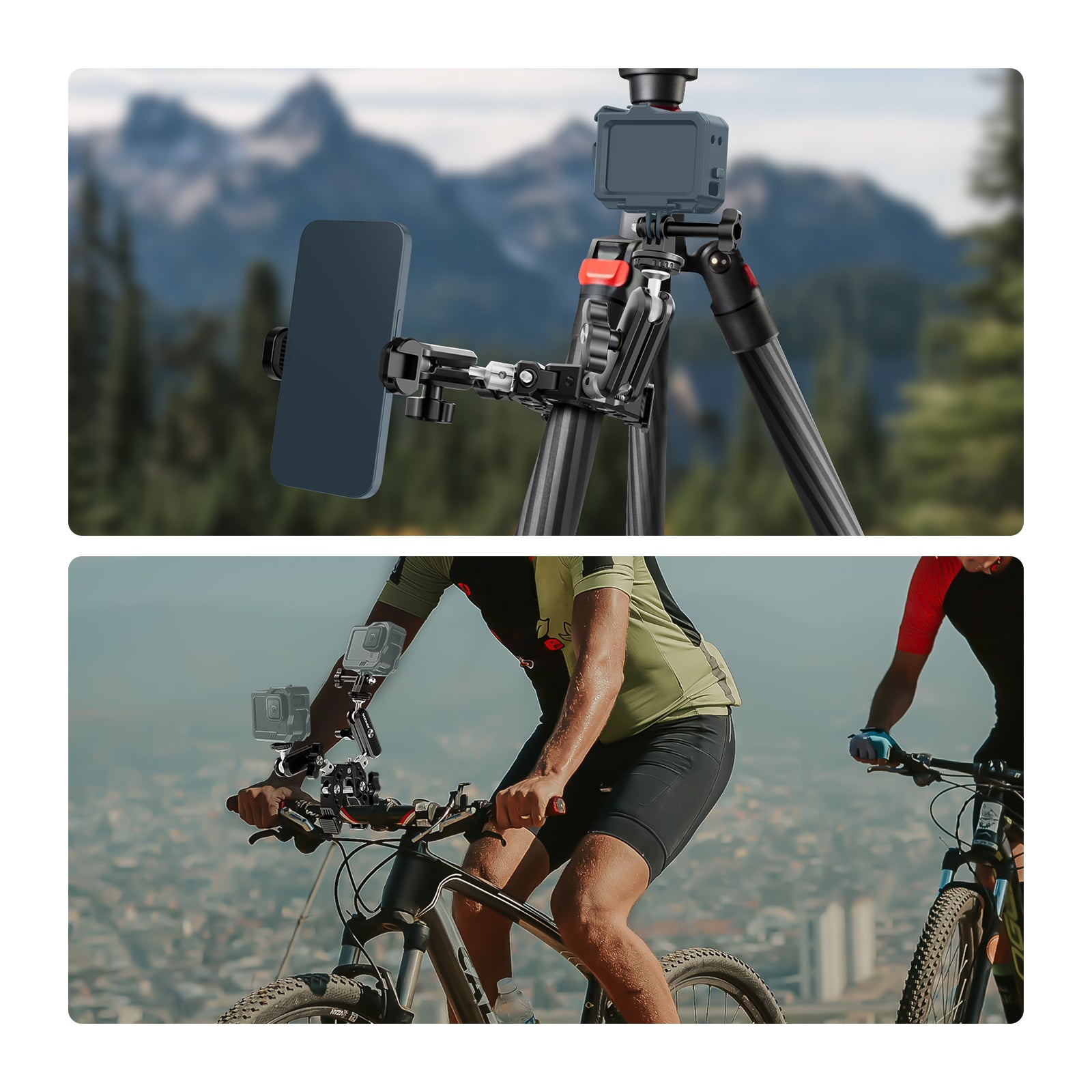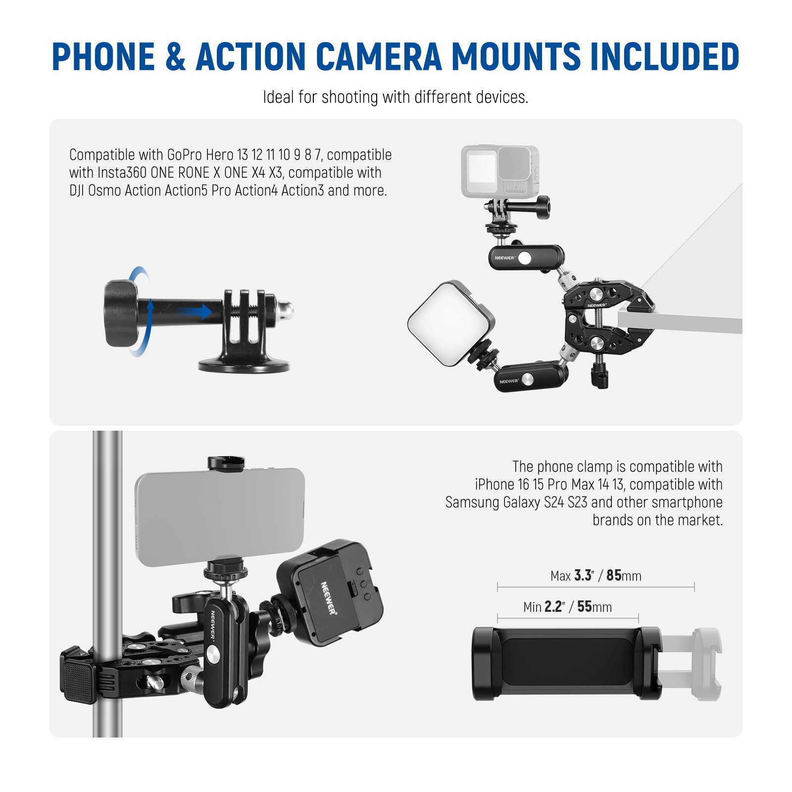 - Phone Holder & Action Camera Adapter Included- The 2.1"-3.3"/54-85mm adjustable phone holder is compatible with iPhone 15 Pro Max 14 13 Samsung Galaxy S24 S23. The action camera adapter is compatible with GoPro Hero 12 11 10 9 8 7 Black go pro max compatible with insta360 x4 x3 insta 360 ace pro compatible with DJI Osmo Action 4 3, etc. Several 1/4" and 3/8" threads and locating holes for ARRI are also for field monitors, LED video lights, microphones, etc.