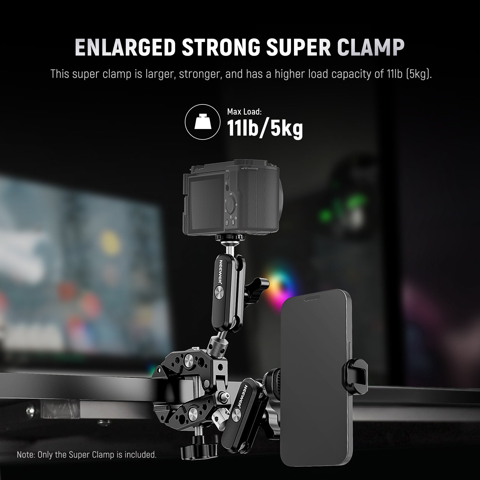 - Enlarged Strong Super Clamp- This enlarged super clamp is upgraded with an 11lb (5kg) high load capacity, supporting DSLR cameras, mirrorless cameras, field monitors, smartphones, action cameras, LED video lights, webcams, and other equipment or accessories, with an extra phone holder and action camera mount adapter for hassle free setup, making it a versatile mounting solution for photography, vlogging, live streaming, video conferencing, and other videography