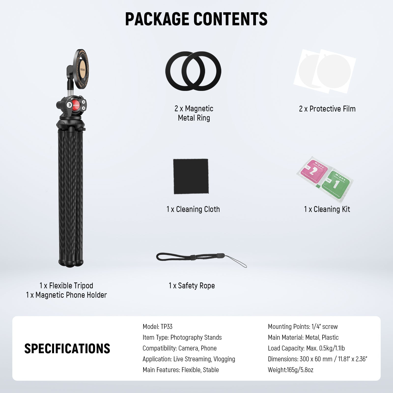 - 1 x Flexible Tripod with Magnetic Phone Holder