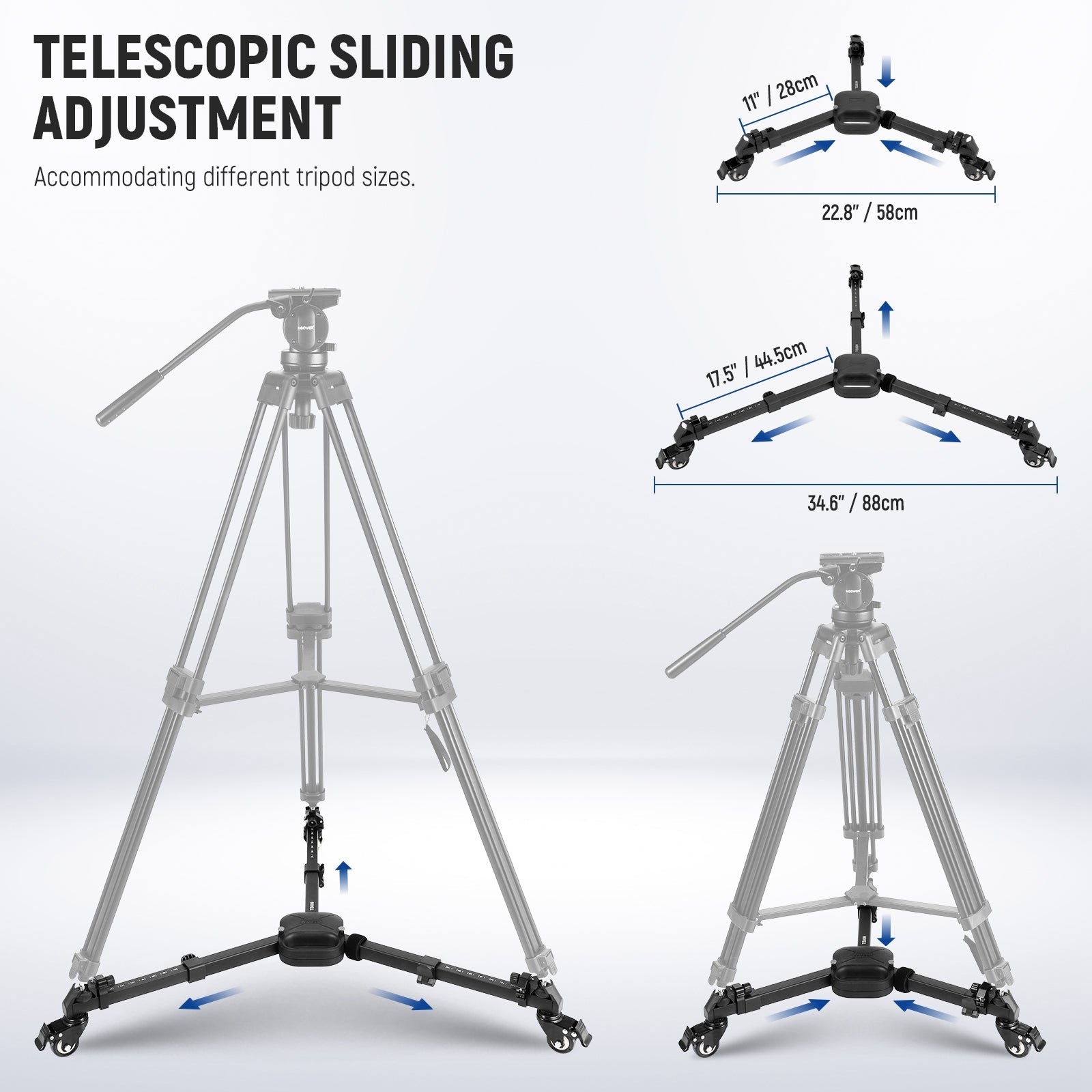 - Telescopic & Sliding Adjustment- The video tripod dolly can extend its diameter from 11"/28cm to 17.5"/44.5cm, accommodating different tripod sizes and opening angles, and enhancing adaptability to cramped studio spaces or expansive outdoor locations