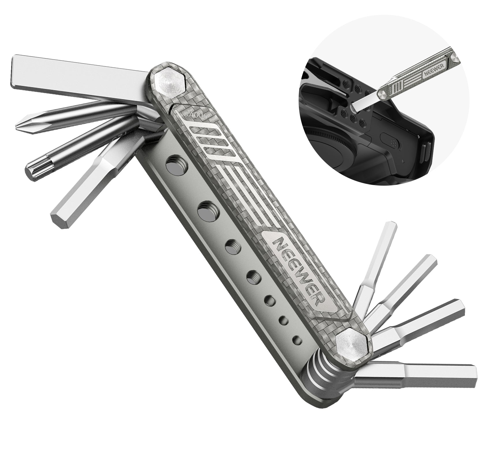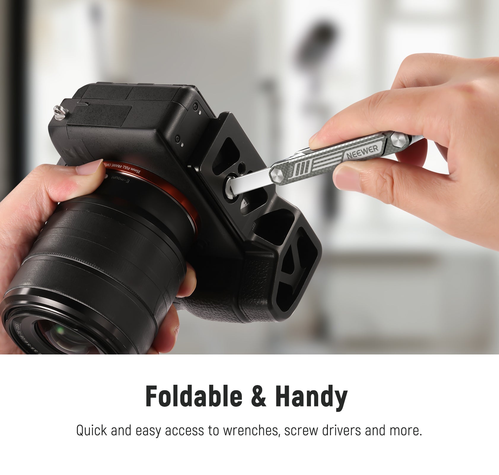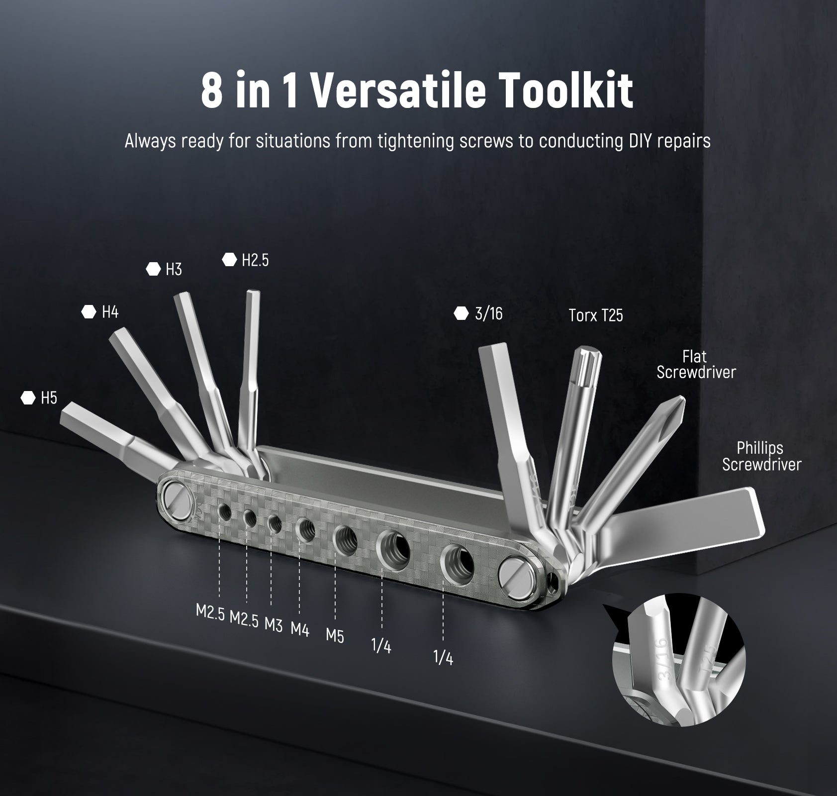- 8 in 1 Versatile Toolkit- Always be ready for any minor fixes or repairs with this must have 8 in 1 folding tool set, featuring 5 types of hex key wrenches (2.5, 3, 4, 5, 3/16), 3 kinds of screwdrivers (Torx T25, Phillips and flat). Ideal for tightening and loosening screws and conducting DIY repairs on camera cages, phone cages, top handles, side handle grips, tripod heads or quick release plates