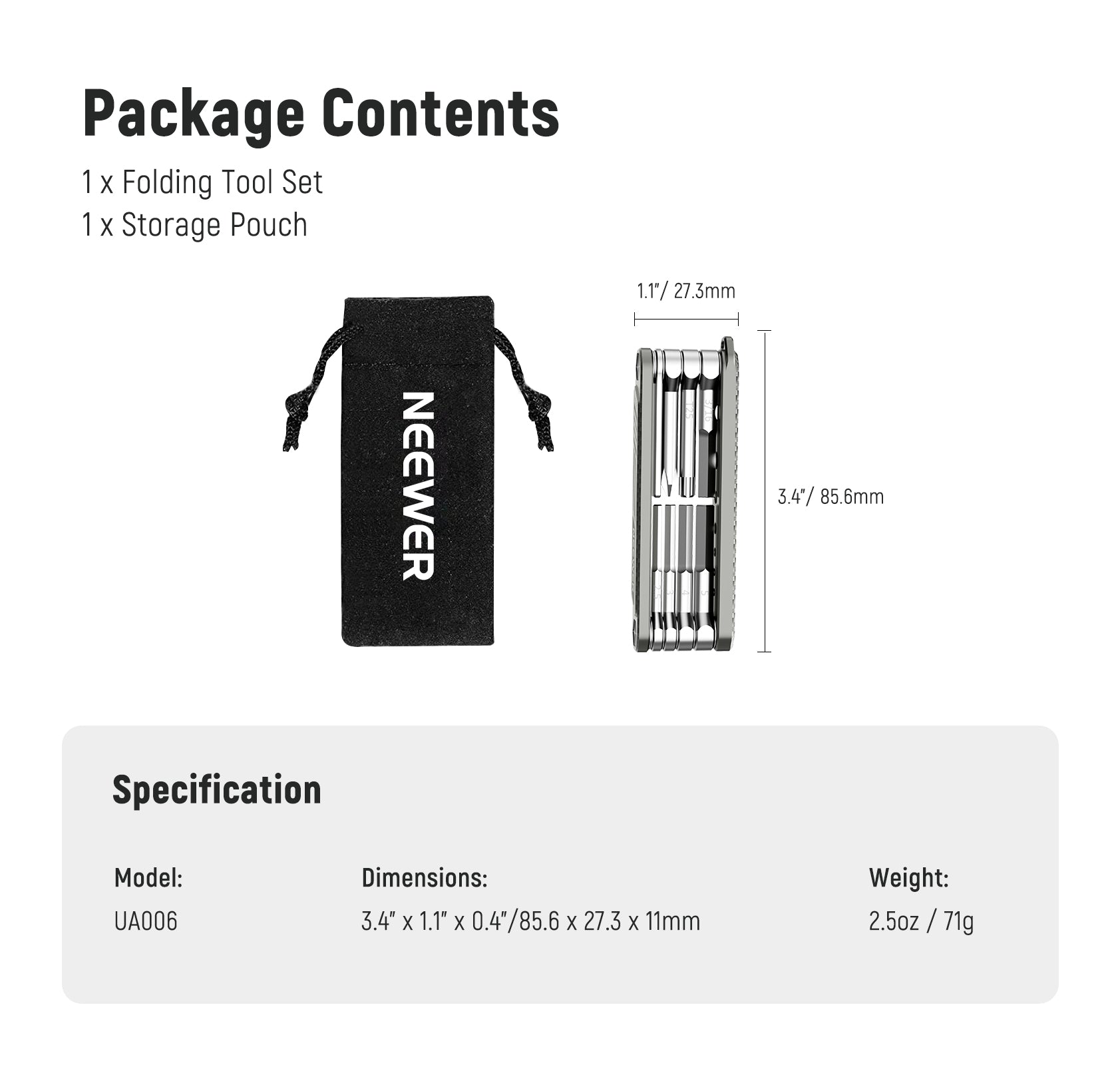 - Pocket Sized Folding Design- At just 2.5oz/71g, this toolkit ensures free and easy access to the eight fold out tools whenever you need them with its collapsible design of 3.4" x 1.1" x 0.4"/85.6 x 27.3 x 11mm that fits into a pocket. Also includes a high quality storage/travel pouch.
