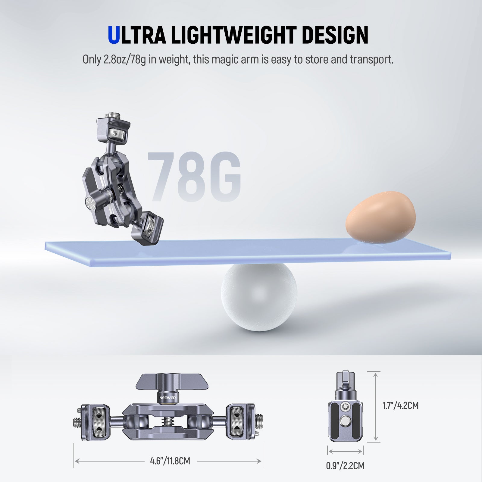 - Ultra Lightweight Design- Optimized with a reduced weight (2.8oz/78g), this magic arm is more ideal for outdoor photography, filmmaking, vlogging, and live streaming. At 4.6"x1.7"x0.9"/118x42x22mm, it is portable and easy to fit inside your baggy