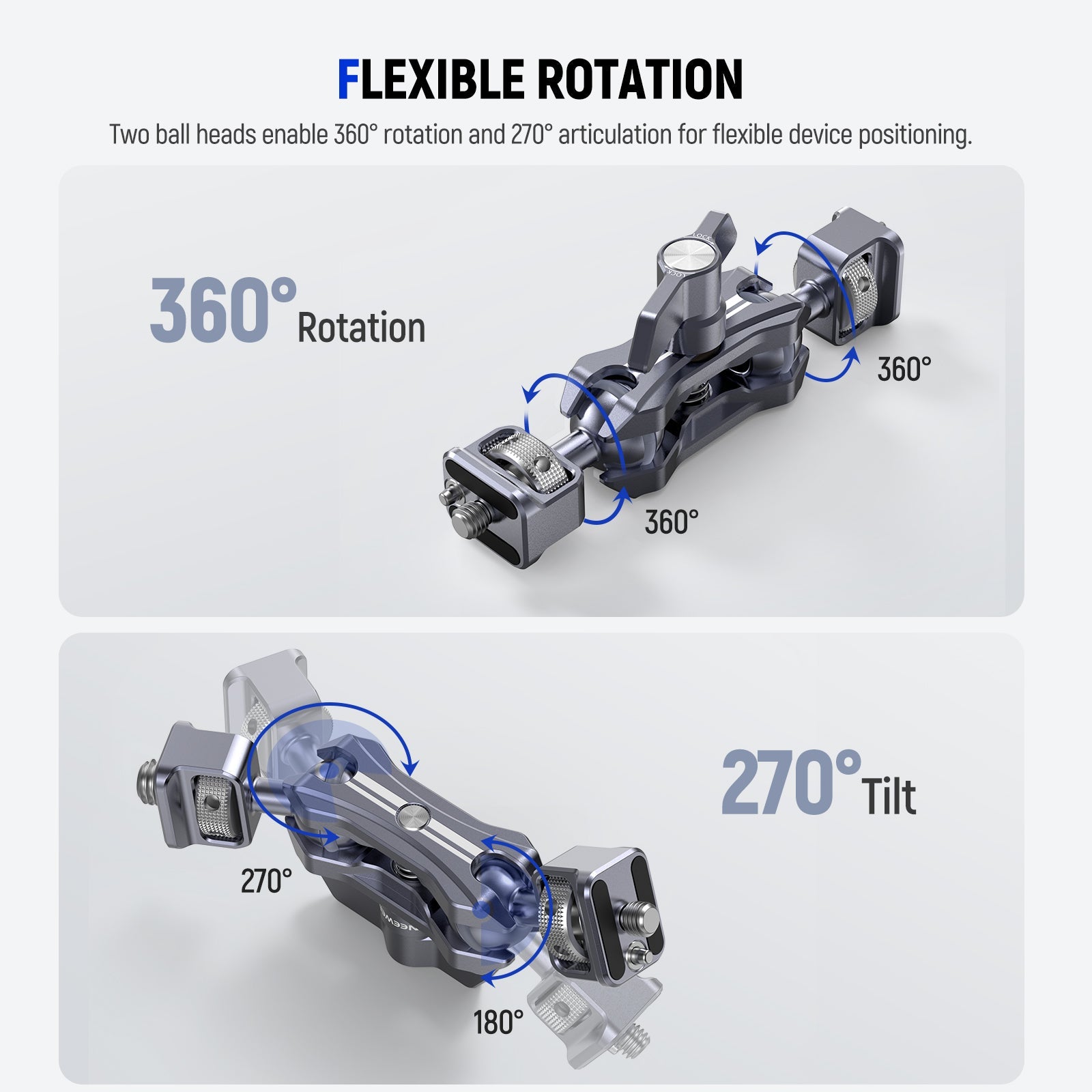 - 360° Rotation & 270° Tilt- This magic arm camera mount with two ball heads enable 360° rotation and 270° tilt for flexible positioning. Rubber rings increase friction for extra security