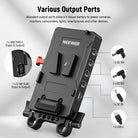 - Efficient V-Mount Battery Adapter- With an impressive conversion rate of up to 90%, this battery adapter plate is an efficient power solution that allows you to power multiple devices via a V-mount battery for extended camera filming, compatible with Fxlion Sony and NEEWER BP-V47 BP-V95 BP-95W and other V mount batteries. A clear battery level display with indicators to check battery status at a glance. The independent power switch saves energy when not in use. No more battery anxiety