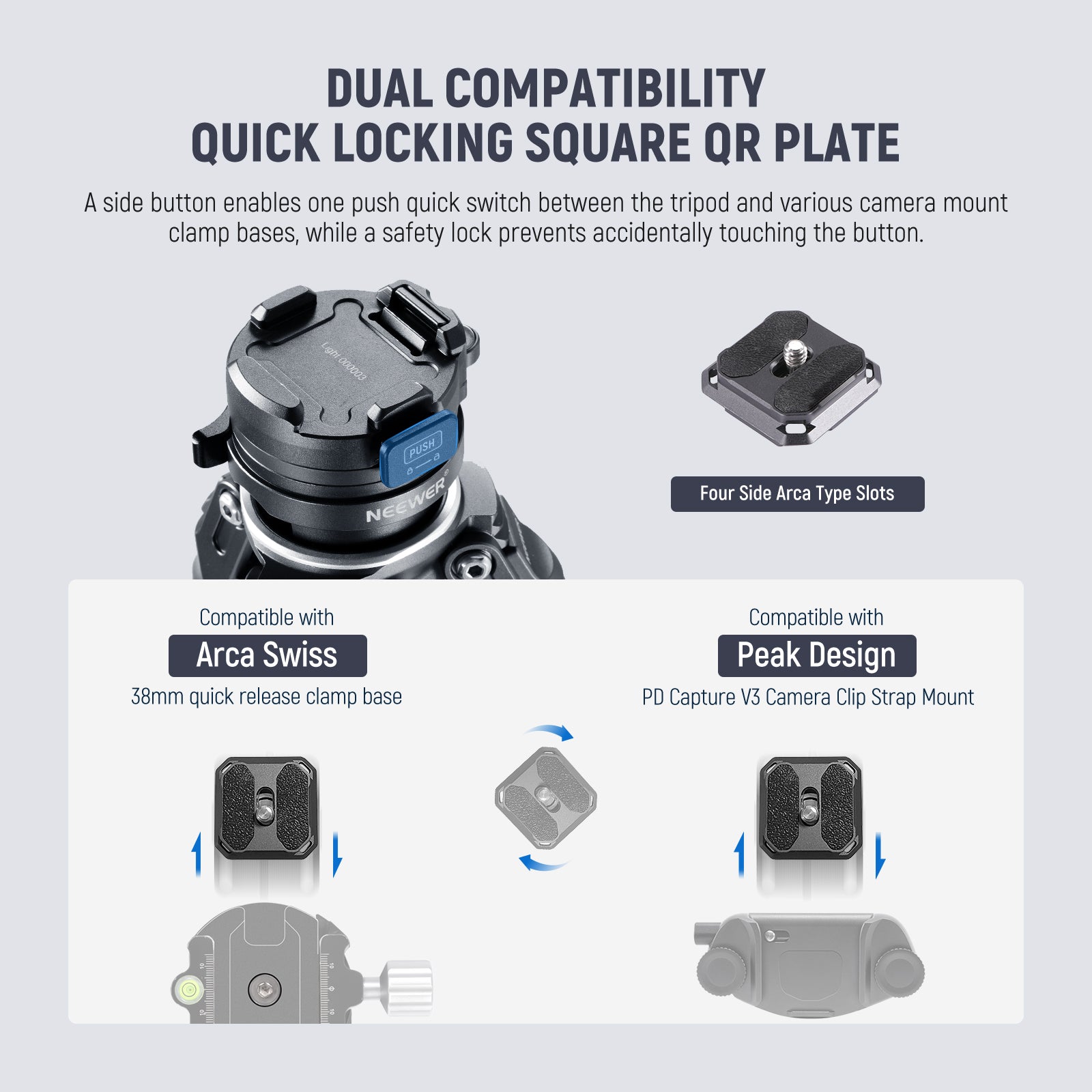 - Arca Type QR Camera Mount- With 4 sided Arca type dovetails, the square quick release plate allows rapid camera mounting and removal without alignment. Besides Arca type clamps, it is also compatible with PD clips for seamless camera transfers. The 1/4" screw suits cameras and camcorders of up to 22lb/10kg. 14.6cm horizontal and 2.6cm vertical adjustments accommodate cameras of different sizes for optimal positioning