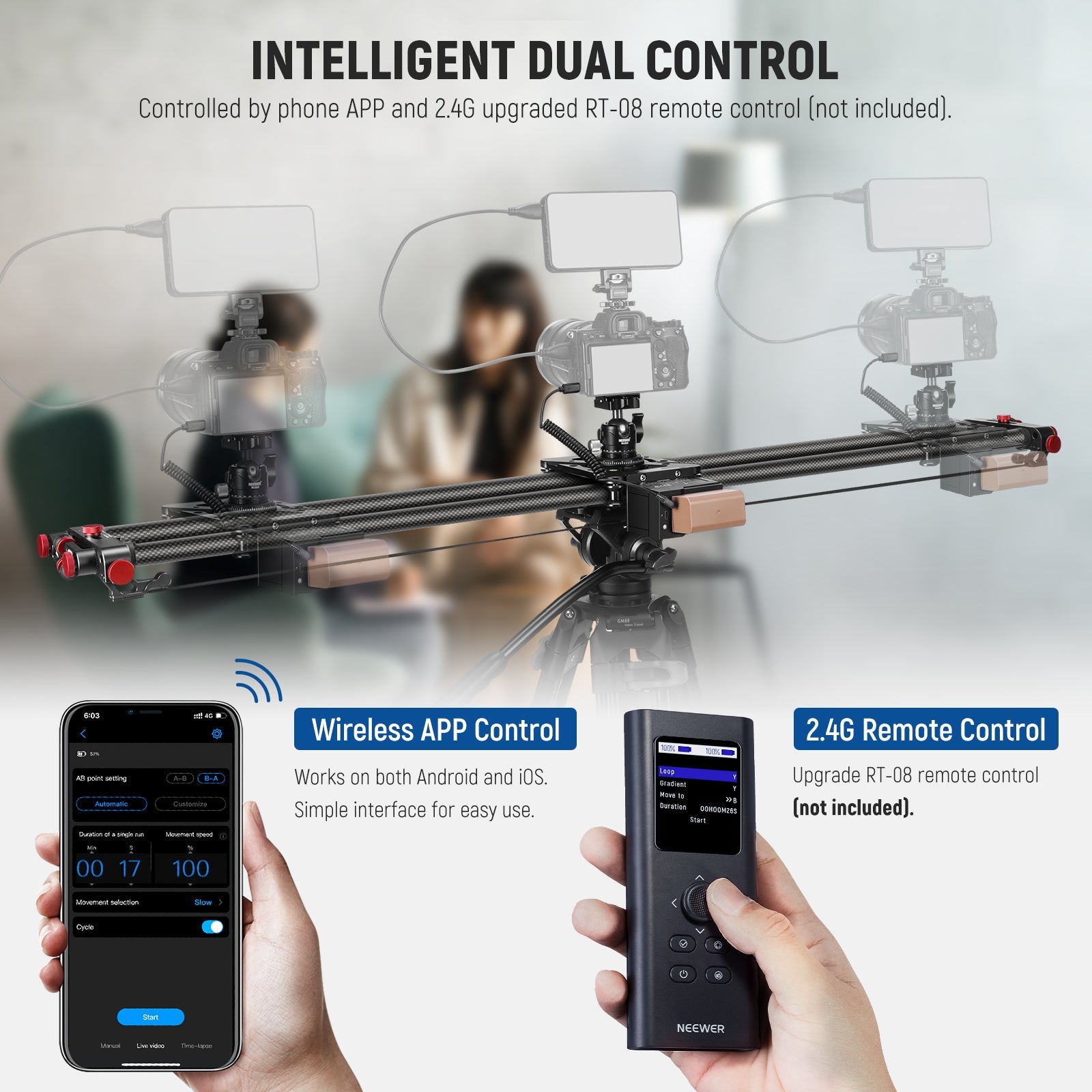 - Smart Two Way Control- The motorized camera slider supports both App control (download the NEEWER app) and 2.4G RT-08 remote control (not included). Designed with manual mode, video mode (with constant speed, slow start/stop), and time lapse, the video slider automatically moves your camera back and forth from a preset start point to an end point. Better control camera motion by changing slider settings including frames, video length, interval, shutter speed (App), exposure time (remote)