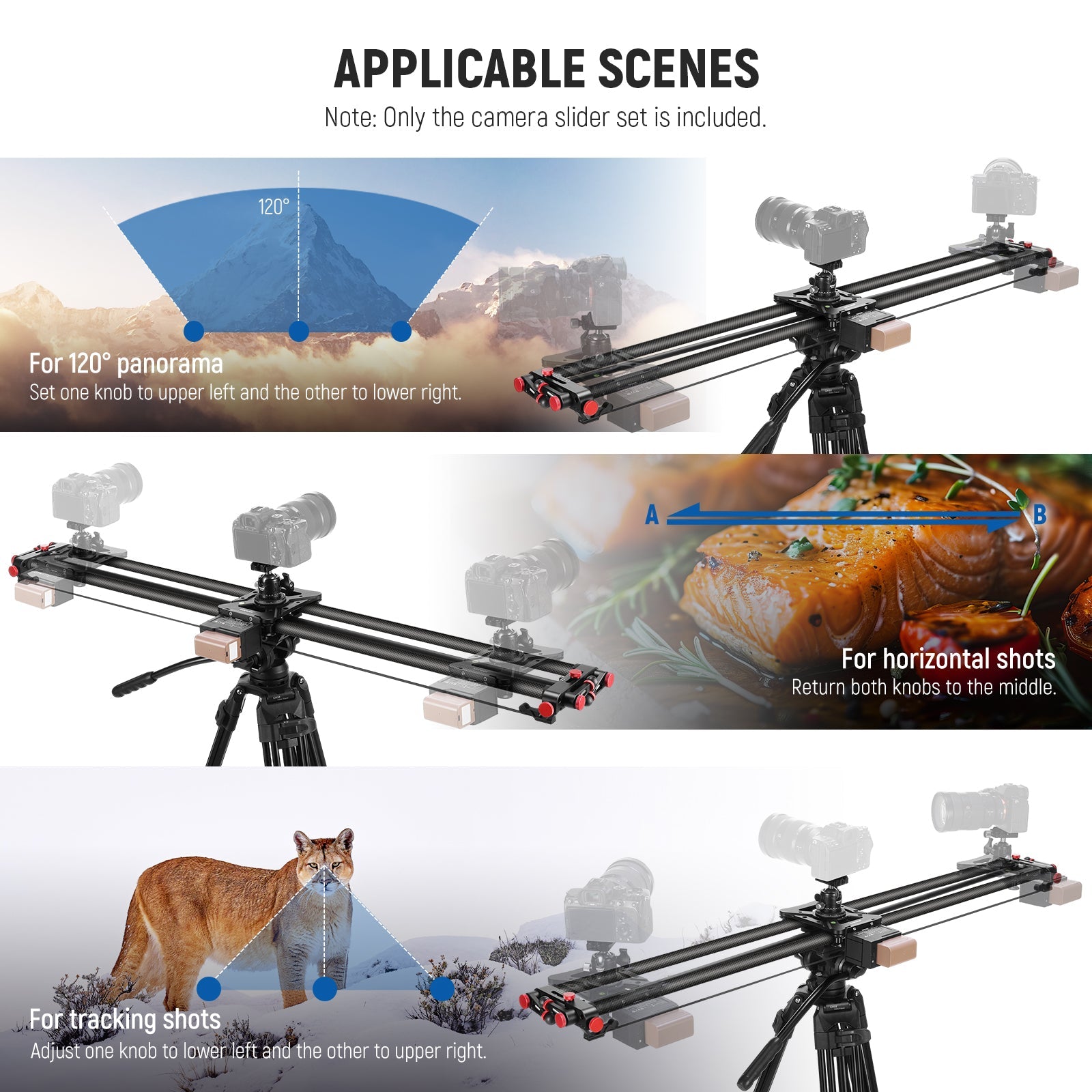 - Multiple Shooting Angles- Featuring adjustment knobs on both sides of the slider to achieve different shooting angles, adjust one knob to the lower left and the other to the upper right for tracking shots, set one knob to the upper left and the other to lower right for 120° panoramas, and resume both knobs to their middle positions for horizontal shots. The slider can also be placed at a 45° tilt angle or 90° vertically