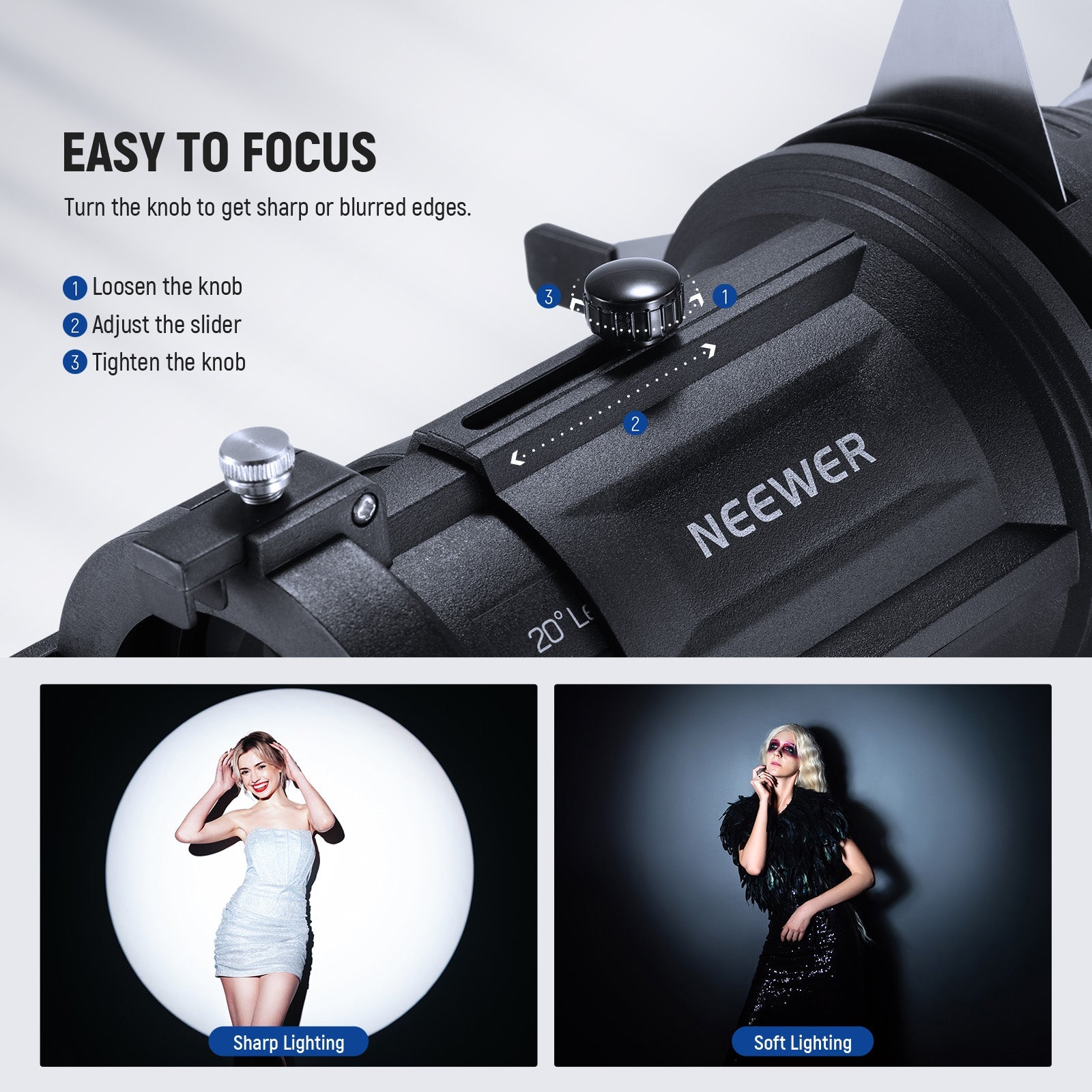 - 20° Light Gathering Projection Lens- When using with a bare MS150B LED Video Light, the snoot creates a ?36cm round beam at 3.3ft/1m and increases the illuminance multiple times. Turn the adjustable focus knob by 20° to achieve sharp or blurred edges. The dramatic spotlight effect is perfect for portrait photography, filmmaking, video recording, and stage photos