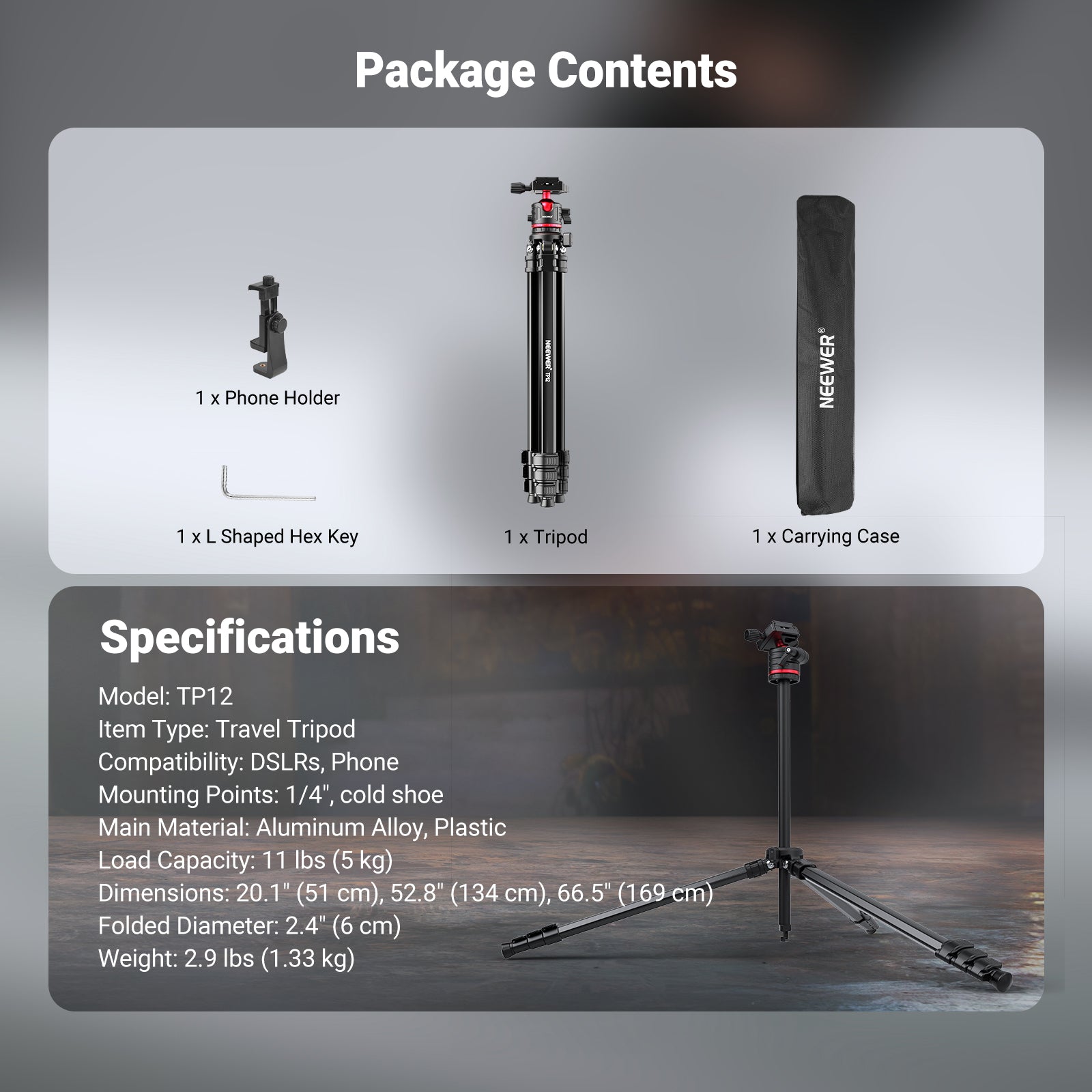 - Superior Stability Compact Travel Tripod- Made of aluminum alloy and plastic, the TP12 heavy duty camera and cellphone tripod stand supports up to 11 lbs (5 kg), but weighs 2.9 lbs (1.33 kg), and it surprisingly features tightly fitted legs to fold to a 2.4" (6 cm) diameter for a single hand grip and on the go. Adjust from 20.1" (51 cm), 52.8" (134 cm) to 66.5" (169 cm), with a liftable center column that is invertible for low angle and macro shots. The non slip rubber feet ensure stability