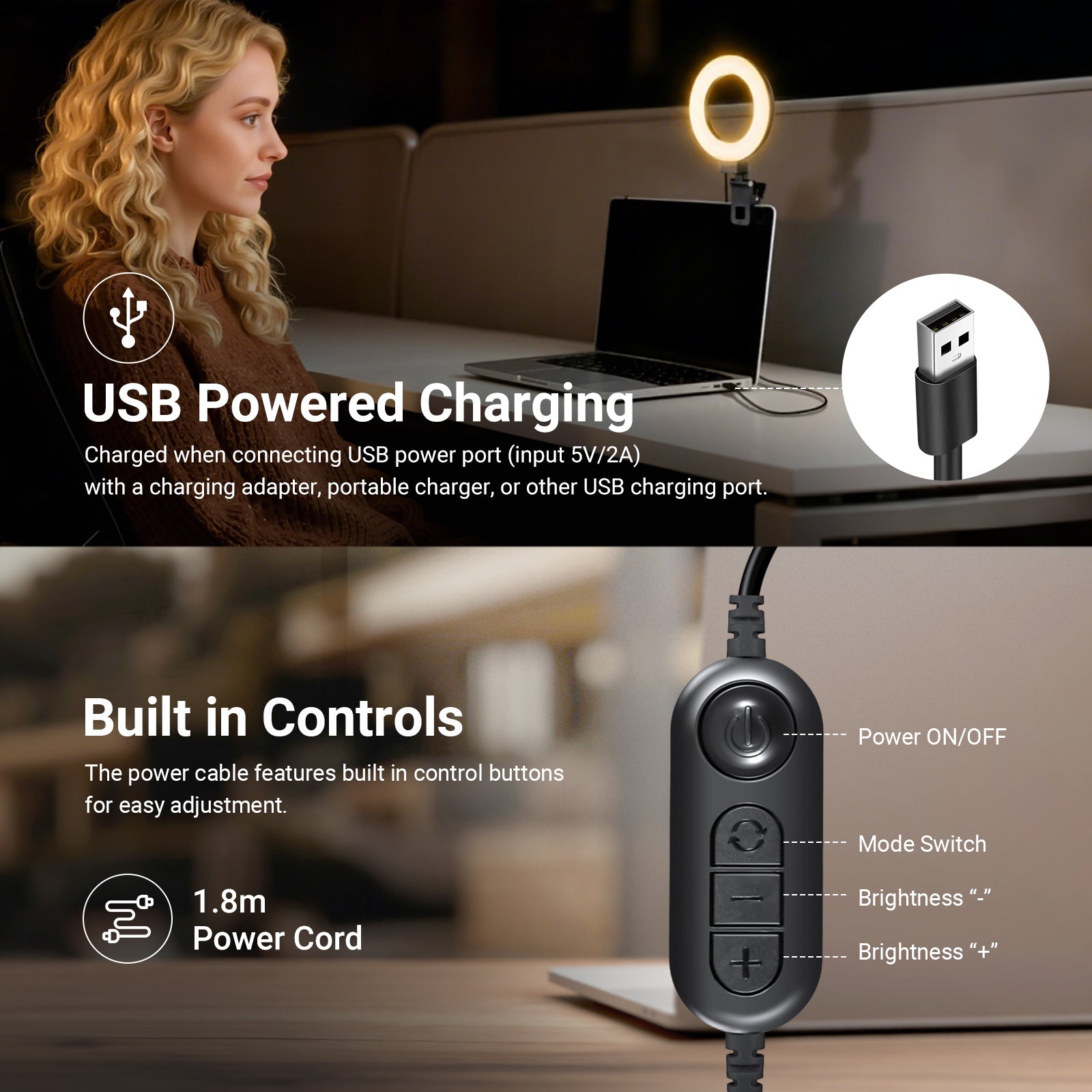 - USB Powered Charging- The 10W LED ring light operates at 5V/2A, with a built in 6ft/1.8m charging cable, and can be powered via USB ports from displays, laptops, mobile power supplies, or phone chargers, providing energy efficient and environmentally friendly lighting solutions.
