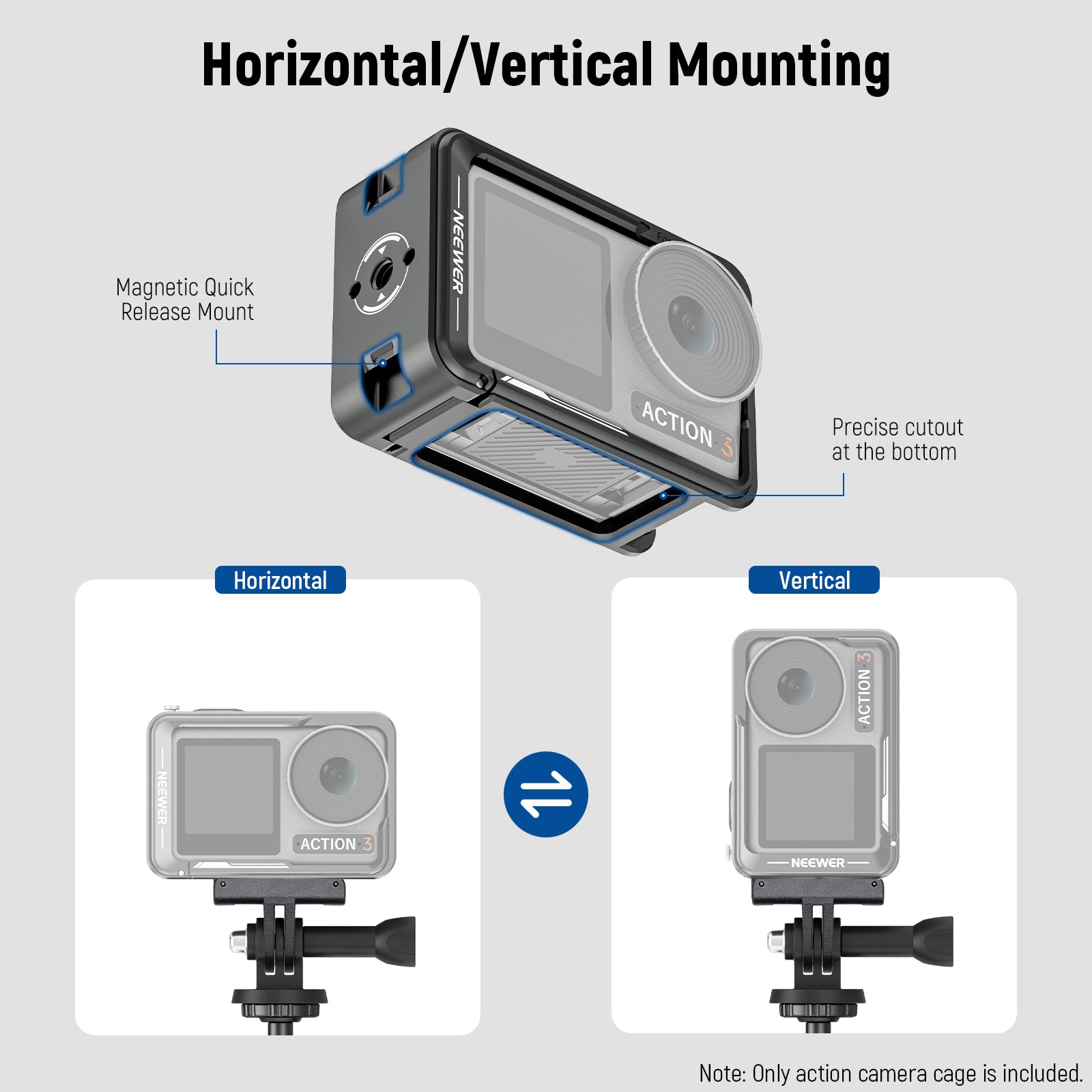 - Magnetic Connection Rapid Horizontal/Vertical Switching- The bottom cutout enables horizontal shooting using the camera's base snap structure. The built-in magnet and snap structure on the right side are compatible with the original DJI magnetic adapter mount for rapid vertical shooting. Or use the side 1/4" thread with positioning holes to mount a tripod for vertical mode