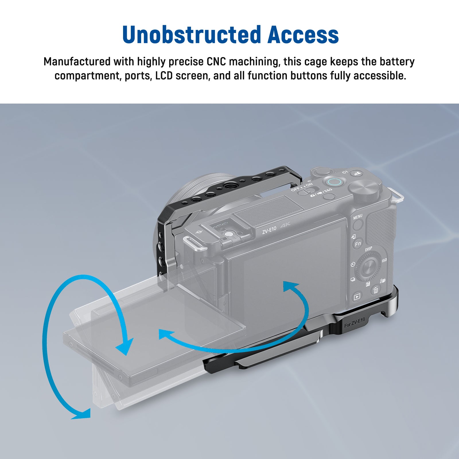 - Compatible with Sony ZV-E10- NEEWER CA003S is a CNC machined aluminum formfitting cage for the ZV-E10 vlog camera. Full access via precision cutouts for buttons, ports, card slots, LCD flip screen, and an expanded hot shoe area to be compatible with Sony ECM-W2BT Microphone HVL-F32M Flash, and other accessories. It also features a slot for the dummy battery cable, allowing flat placement on tables. Weighing just 4.6oz/129g, this cage is lightweight yet robust and protective