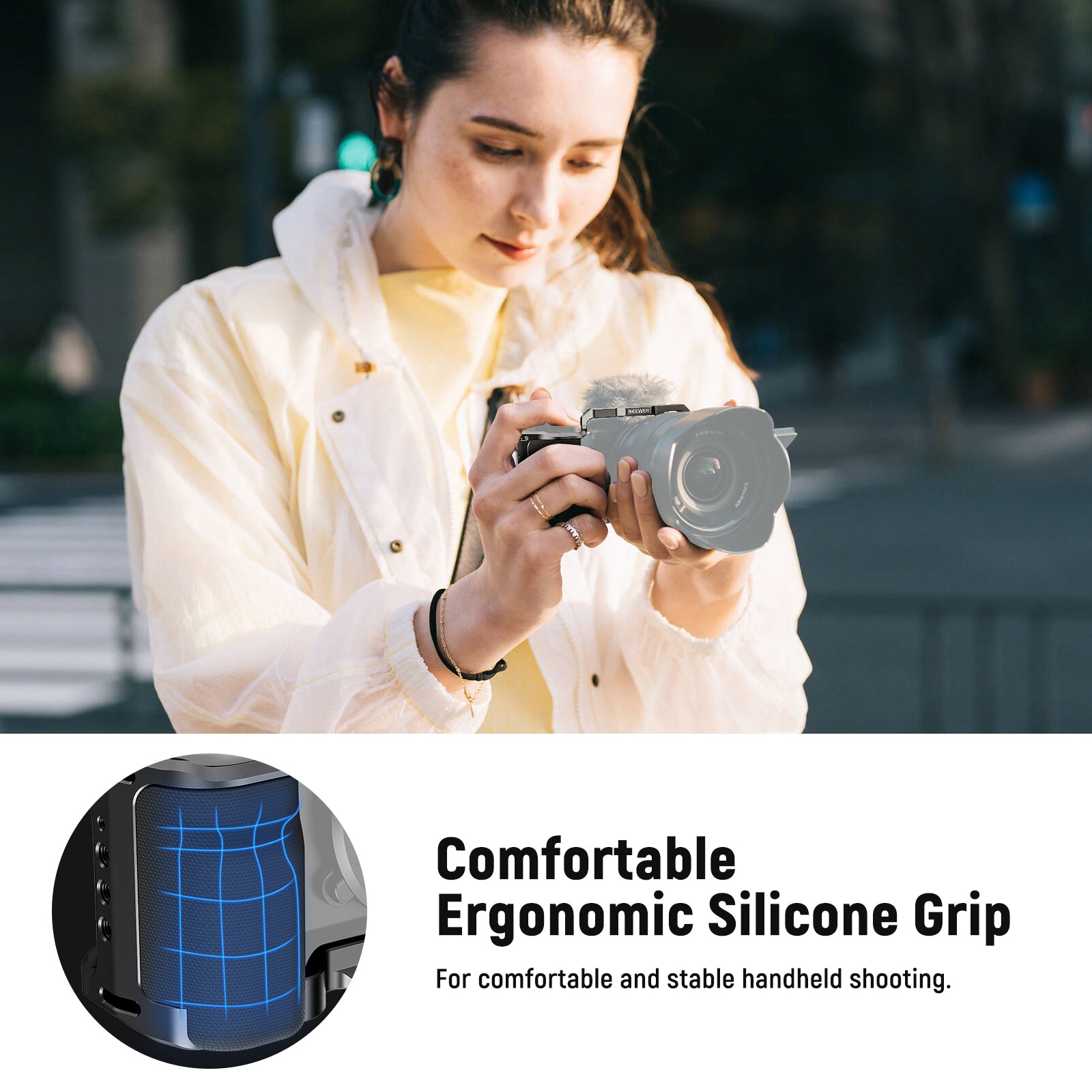 - Comfortable Ergonomic Silicone Grip- Designed for ergonomic handheld shooting, the nonslip silicone grip allows you to firmly hold the caged camera while ensuring a secure and comfortable grip