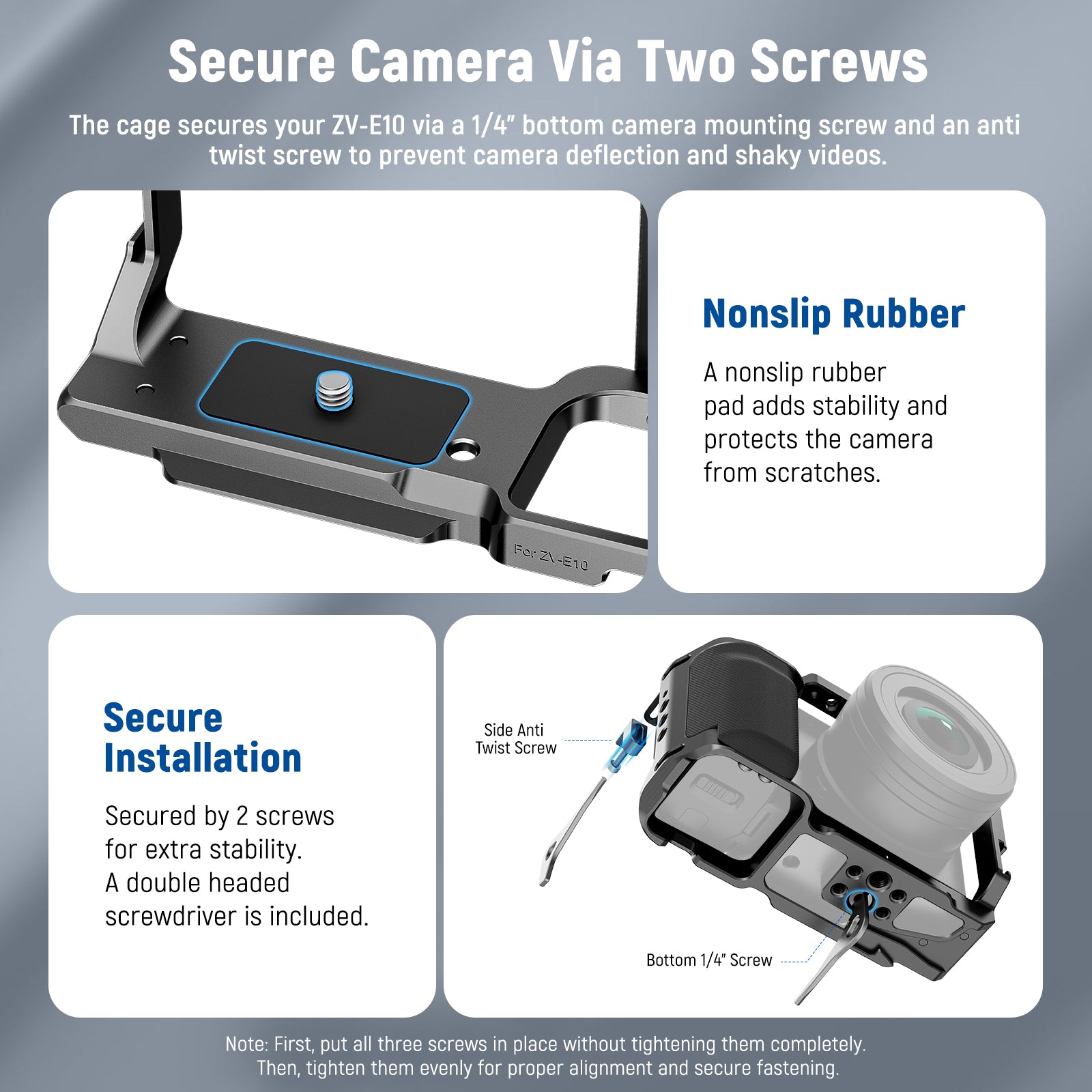 - Secure Camera Via Two Screws- The cage secures your ZV-E10 via a 1/4" bottom camera mounting screw and an anti twist screw to prevent camera deflection and shaky videos. A nonslip rubber pad adds stability and protects the camera from scratches